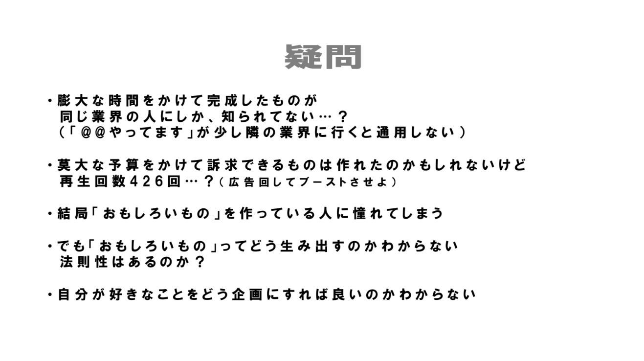 大コンテンツ時代の到来です。膨大に溢れかえるエンタメの中で、テレビ、SNS、CM、ライブなどフィールドは関係ありません。横一直線。 視聴者の限られた可処分時間の中に向けて、我々は「強烈に見たいもの」を提供するしか無いのです。 この時代に、何かを残したい人!あつまれー!!!