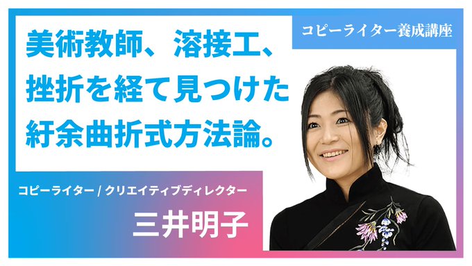 Noと言われてきた人のための、実務直結型コピーライティング講座。美術教師や化粧品宣伝部、広告会社での転職を経ながら実力を磨き、自身の言葉で多くの人の心を動かしてきた三井氏が贈る実践講座です。