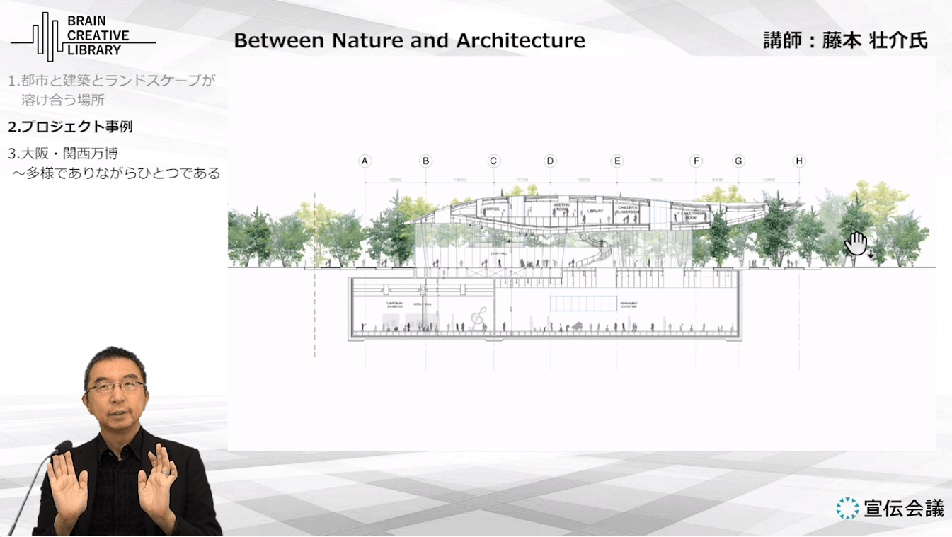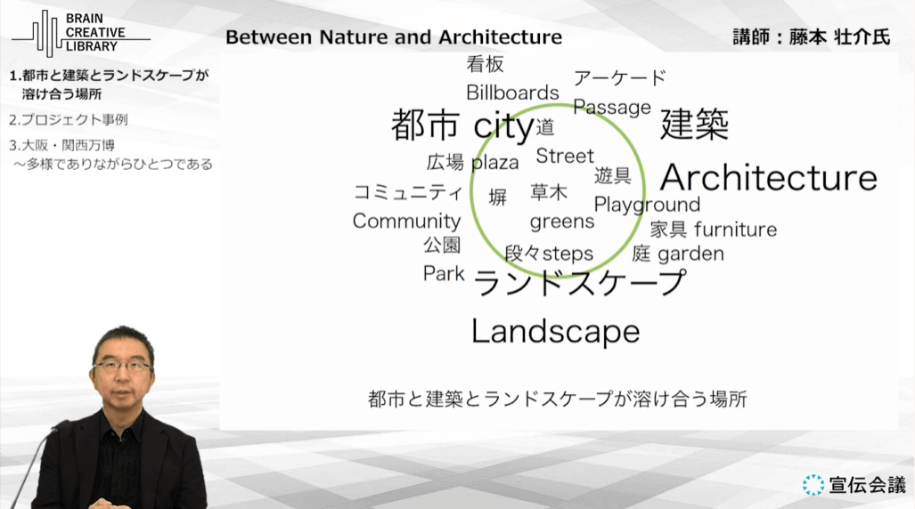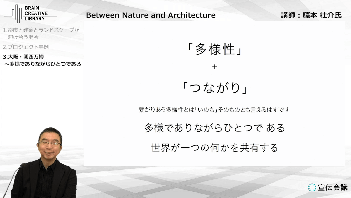 藤本氏が大切にする「Between Nature and Architecture」の概念から、人々の活動が自然に生まれ・多様性がつながり・未来へと続いていく社会像を語ります。