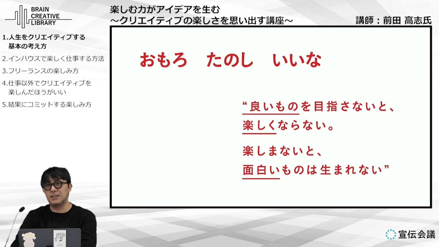 前田氏が講義で繰り返し語る「当たり前思考」とは、自分の好き・感覚・思い込みではなく、“誰もが納得できる理由”を軸に選択する姿勢です。これはクリエイティブだけでなく、人生全体をデザインするための基礎思考であり、仕事の大小に関わらず楽しむための土台となります。この積み重ねから「楽しむ=成果につながる」状態を生み出し、安定したクオリティと制作プロセスの一貫性を持つ人材を目指します。