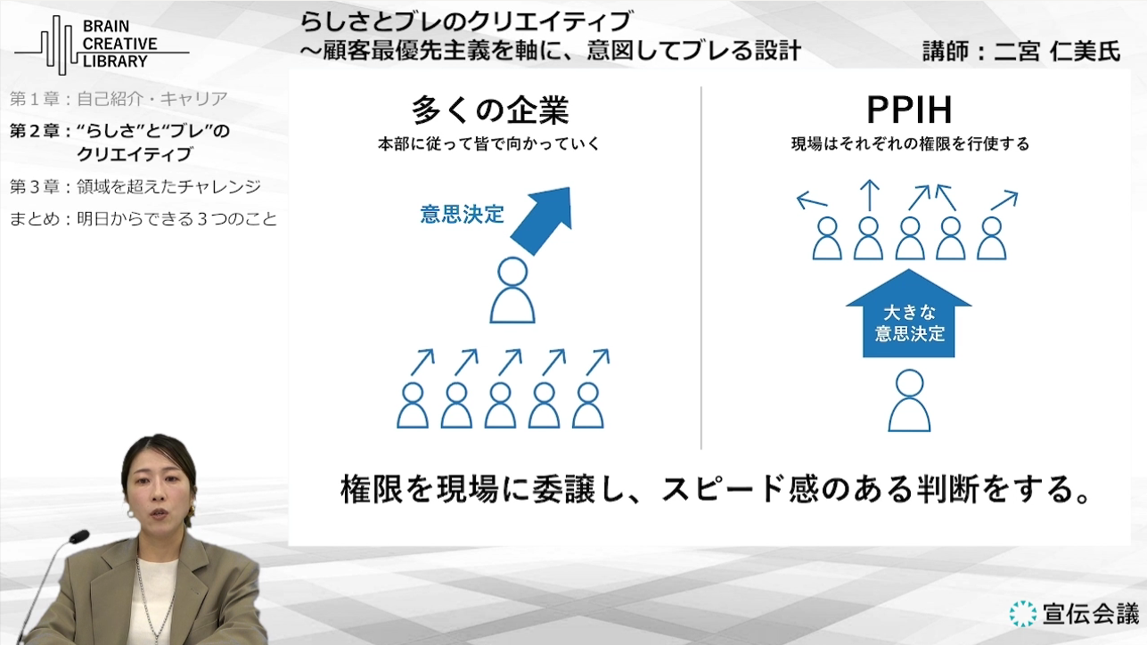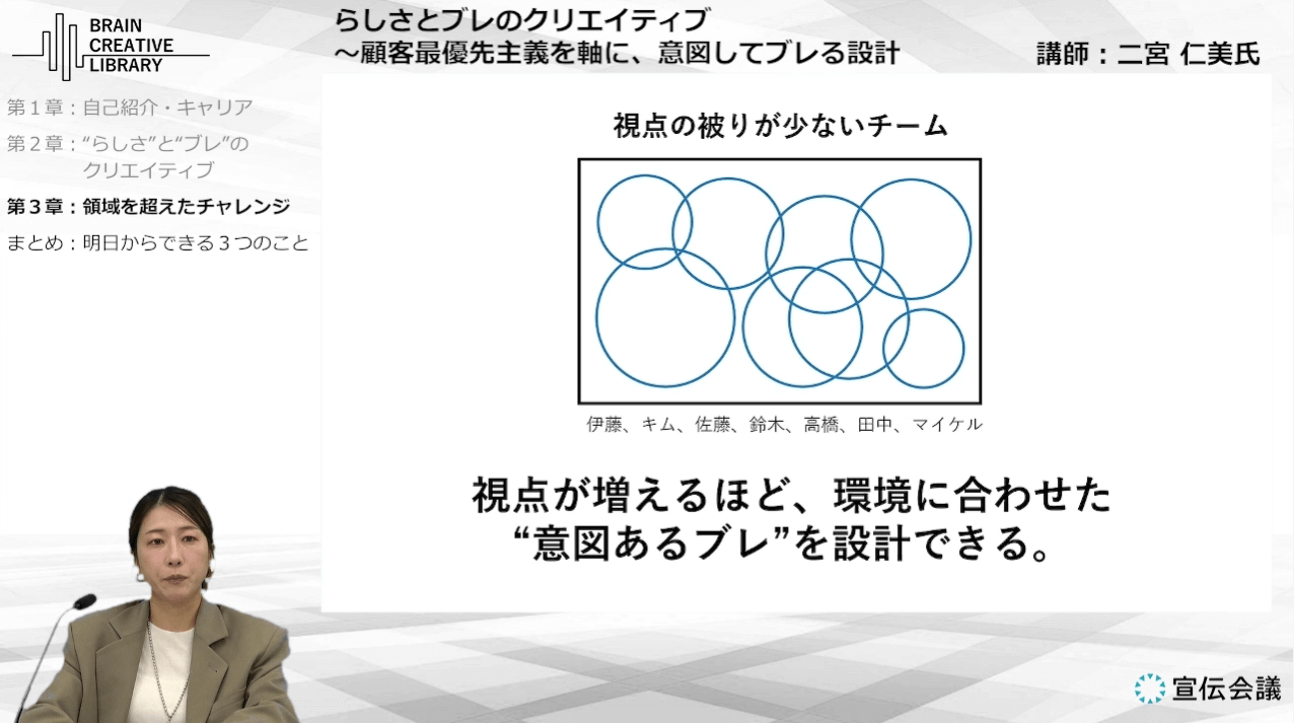 二宮氏が実務で徹底してきた「顧客最優先主義」を軸としたデザイン判断基準を紹介。企業理念や市場環境を踏まえ、「揺るがない軸」があることで大胆にブレることができるメカニズムを解説します。自身や自社にとっての“らしさ”をどのように言語化し判断の拠り所にするか、実務に落とし込みながら理解できます。