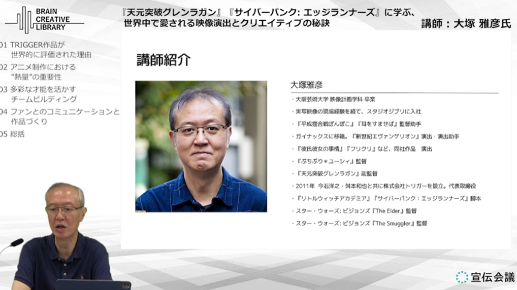 約120分 | 01 TRIGGER作品が世界的に評価された理由 Anime Expo、Otakon、Anime NYCでの反響 『サイバーパンク: エッジランナーズ』の視聴実績 アニメ需要のさらなる高まり 20年前、海外イベントで感じたこと オリジナリティとマーケティングに依らない企画 ⇒面白さの基準は自分たちにしかない 02 アニメ制作における”熱量”の重要性 商業アニメは大人数チームによる創作活動 一人一人の士気 → 効率と品質に直結 スタッフが盛り上がるから、ファンも盛り上がる 熱量は絵に表れる 03 多彩な才能を活かすチームビルディング メインスタッフ編成をどう組むか? 高畑監督との仕事で感じたこと 管理部門と現場、それぞれの特徴と重要性と組織づくり 新人育成への取り組み …「見て覚えろ」の時代から脱却 04 ファンとのコミュニケーションと作品づくり ガイナックス時代に始めたファンとの交流イベント ファンとの交流はトリガー設立の大きな要因 作品視聴以外にもファンとの接点を 05 総括 ストーリーが大事 作画はパフォーマンス |