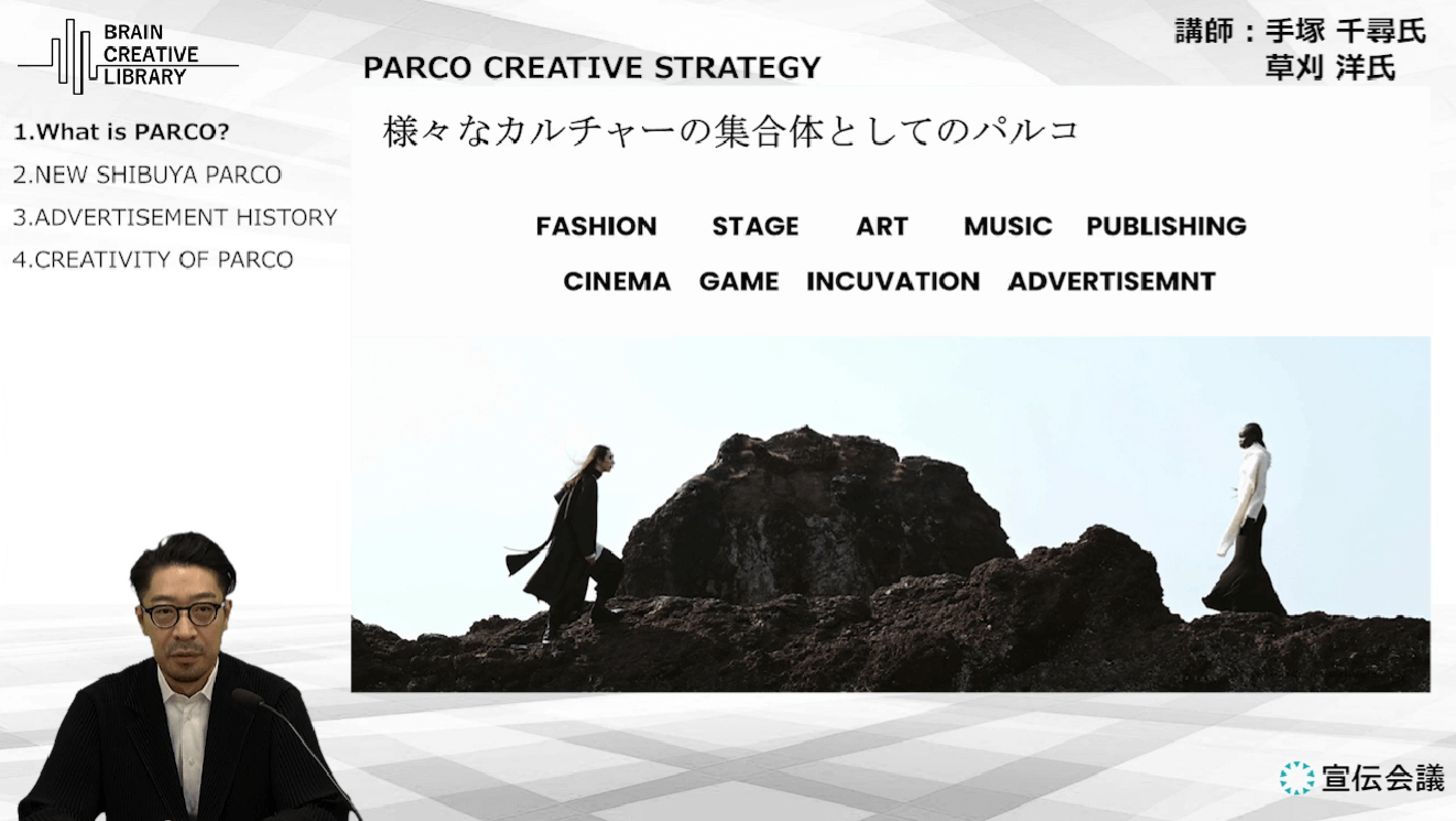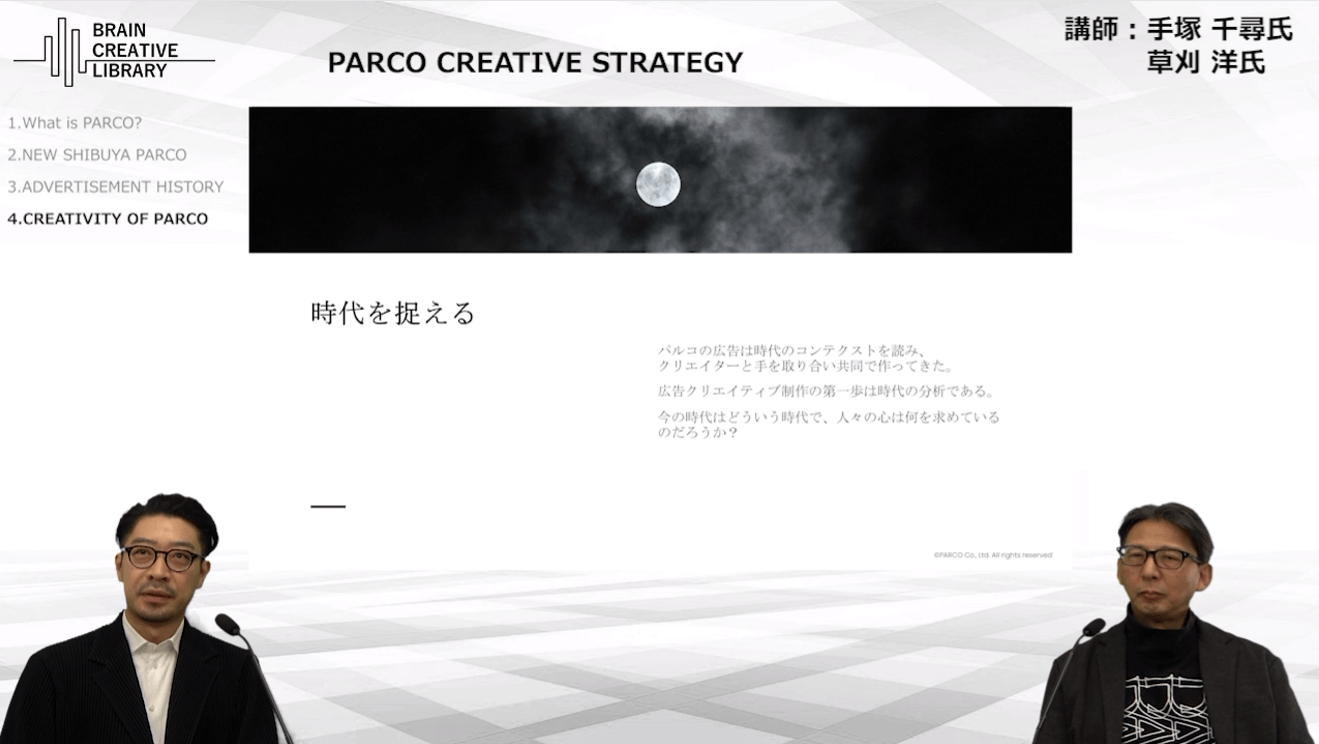 パルコのクリエイティブは、突飛なアイデアや強い表現から始まっているわけではありません。講義では、1969年の創業背景や時代性、企業としてのビジョン・パーパスを起点に、広告や表現がどのように生まれてきたのかを丁寧にひも解いていきます。