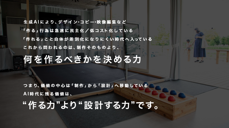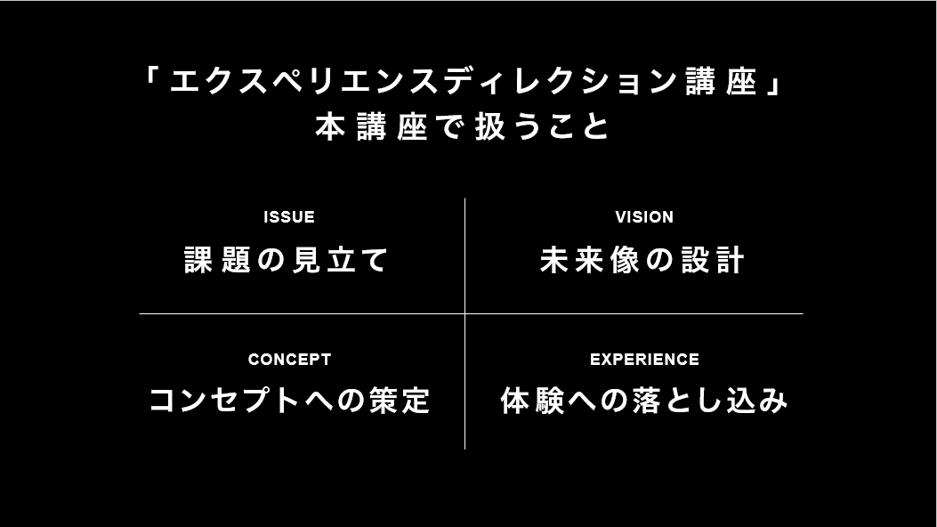 表現技術が民主化され、誰もが「つくれる時代」になった今、本当に問われているのは「何を、なぜ、つくるのか」という構想力ではないでしょうか。本講座では、社会課題を起点にビジョンを描き、コンセプトとストーリーを生み出し、空間体験として実装するまでのプロセスを体系化。ケーススタディ/実践ワーク/フィードバックにより、再現性の獲得を目指します。