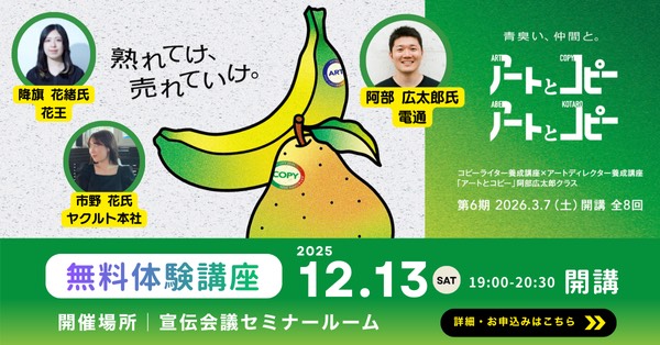 コピーライター養成講座 基礎コースや先輩コースで講師を務め、自身もコピーライター養成講座修了生でもある阿部広太郎氏が講師を務める、コピーライター養成講座×アートディレクター養成講座「アートとコピー」コース 阿部広太郎クラスを開講いたします。