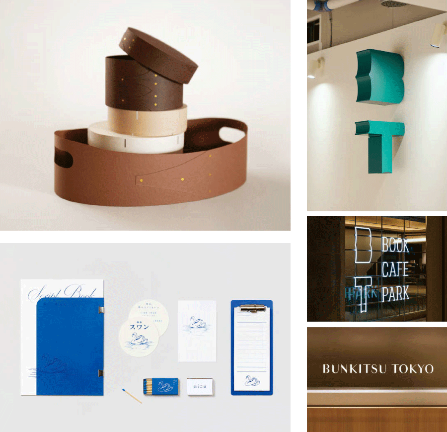 紙商社の企画展出品作品「かつて木だったものたち」(org:竹尾)、書店のサイン「BUNKITSU TOKYO」 (cl:ひらく)、美術館の企画展ポスター「つくりかけラボ