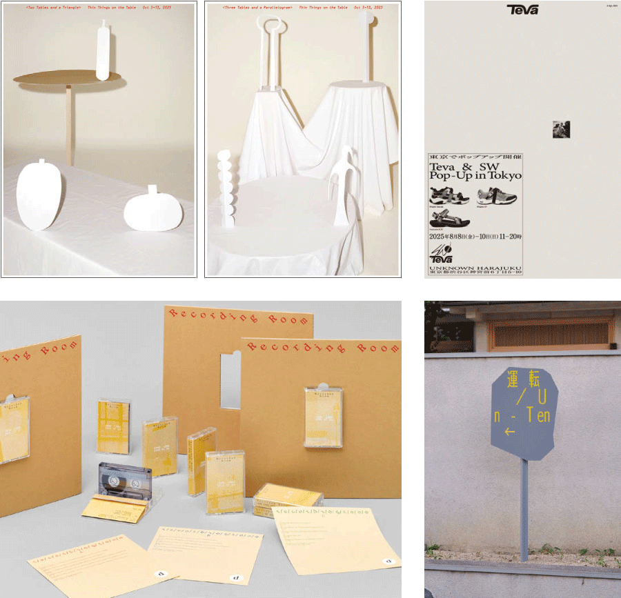 プロジェクトスペースのツール・グッズ「運転」(cl:運転)、自動楽曲制作装置の空間・ツール・グッズ「Recording Room」(org:YMP)、共同企画展のポスター「テーブルの上のスィンスィン」(org:YMP)、靴ブランドの販売会ポスター「Teva & Sean Wotherspoon Pop-Up」(cl:テヴァ)ほか