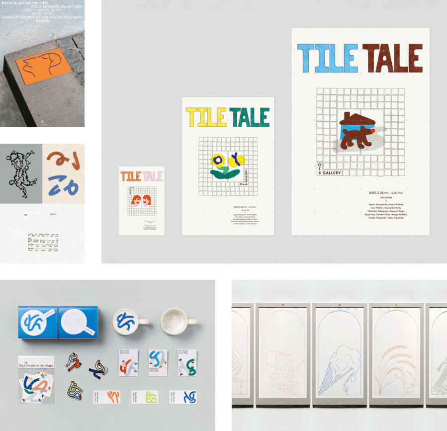 紙商社の企画展ポスター・出品作品「景色を描く紙、あるいは紙が描いた景色」(org:竹尾)、ショップ&ギャラリーの企画展ポスター「TILE TALE」(org:アワフェイバリットショップ)、カレンダー「サン・アドカレンダー2025季節の質感」(cl:サン・アド)ほか