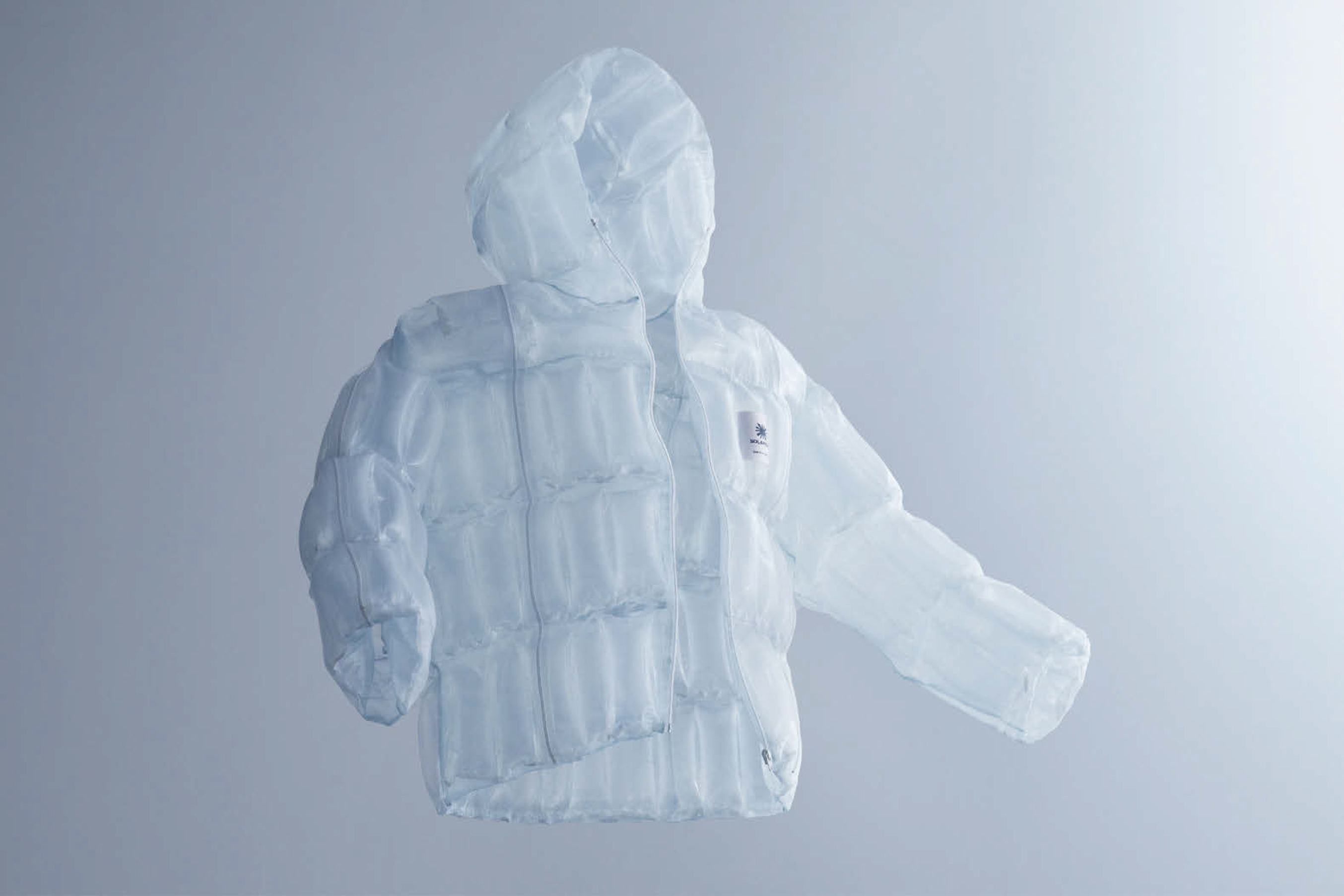 (01)第一弾として2023年10月に公開されたプロトタイプ 「SOLAMENT DOWN-LESS DOWN JACKET」。透明で軽く、羽毛を使用していないのに暖かい、というのが特徴。