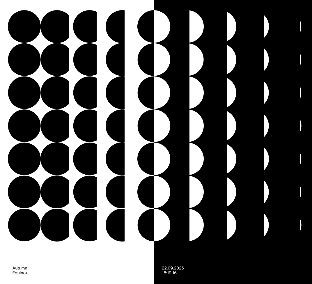 正方形から円へと変化するモジュールのグリッドシステムを用いて制作しました。各ユニットの中では白と黒のみを使い、円で地球に反射する光を表すことで、秋分の日の昼と夜の均衡を示しています。これらのモジュールを繰り返しパターンとして配置することで、地球が太陽を周回するリズムや、秋分を特徴づける周期的な対称性を表現しました。