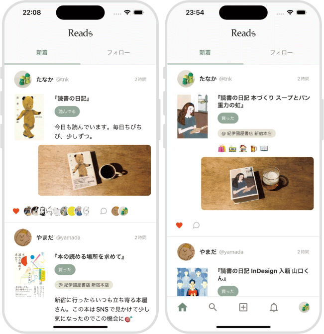読書記録SNSアプリ「Reads」のタイムライン。書籍情報をベースに、読書状況のタグや自由なコメント、写真を付けて投稿できる。購入した書店もタグ付け可能。