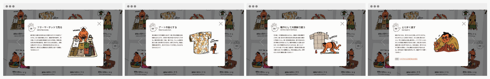 各決まり手をクリックすると表示される説明は、力士らしく語尾を「ごわす」で統一した。レイアウトをあえて斜めにしたり、アニメーションで動きを加えたりと、遊び心あるサイトへと仕上げた。