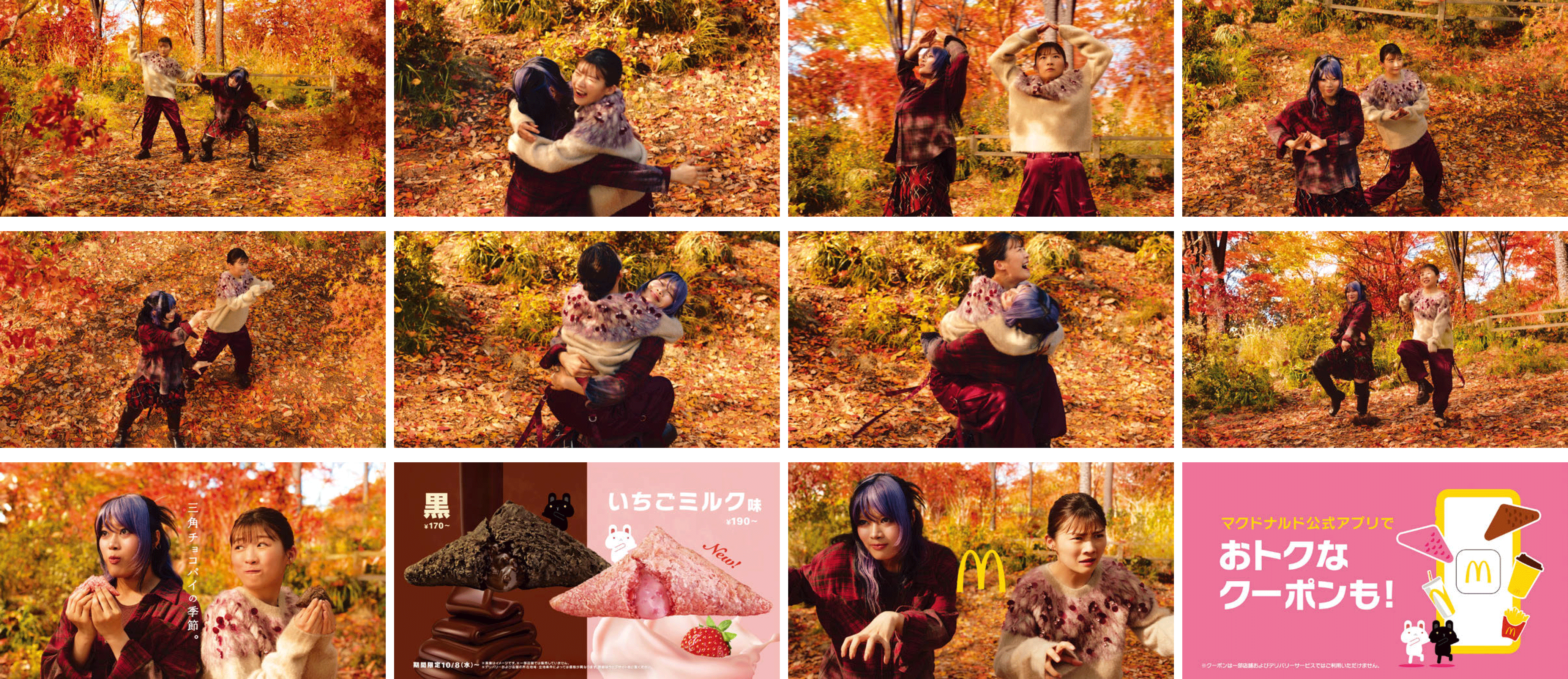 | ♪(伊藤+NAOKO): | 今年~もついに食べれる 今年~もやっと食べれる われら~の秋がきた~ うちら~の秋がきたぜ Yeah! 三角っ!チョコパイの季節~ 三角っ!チョコパイの季節~ 君と!チョコパイの季節~ 今年は黒といちごミルク風~ |