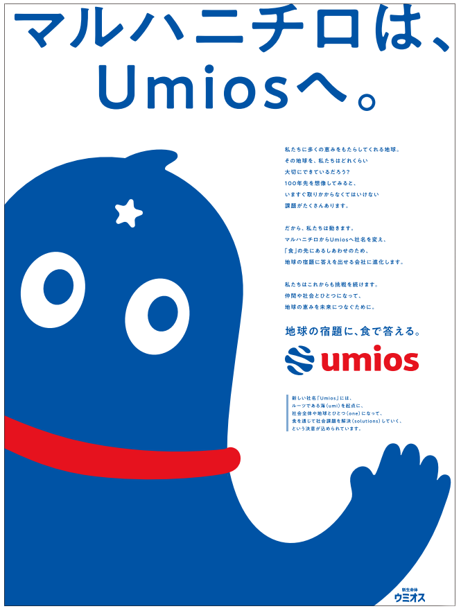マルハニチロが3月1日、社名をUmiosに変更した。新たにパーパスとして「For the ocean,for life」を掲げ、「ソリューションカンパニー」への進化を試みている。新社名の浸透という難題に対して打ち出したのは新生命体「ウミオス」というキャラクター。複雑なメッセージを「直感」で伝えるために心がけていることとは。