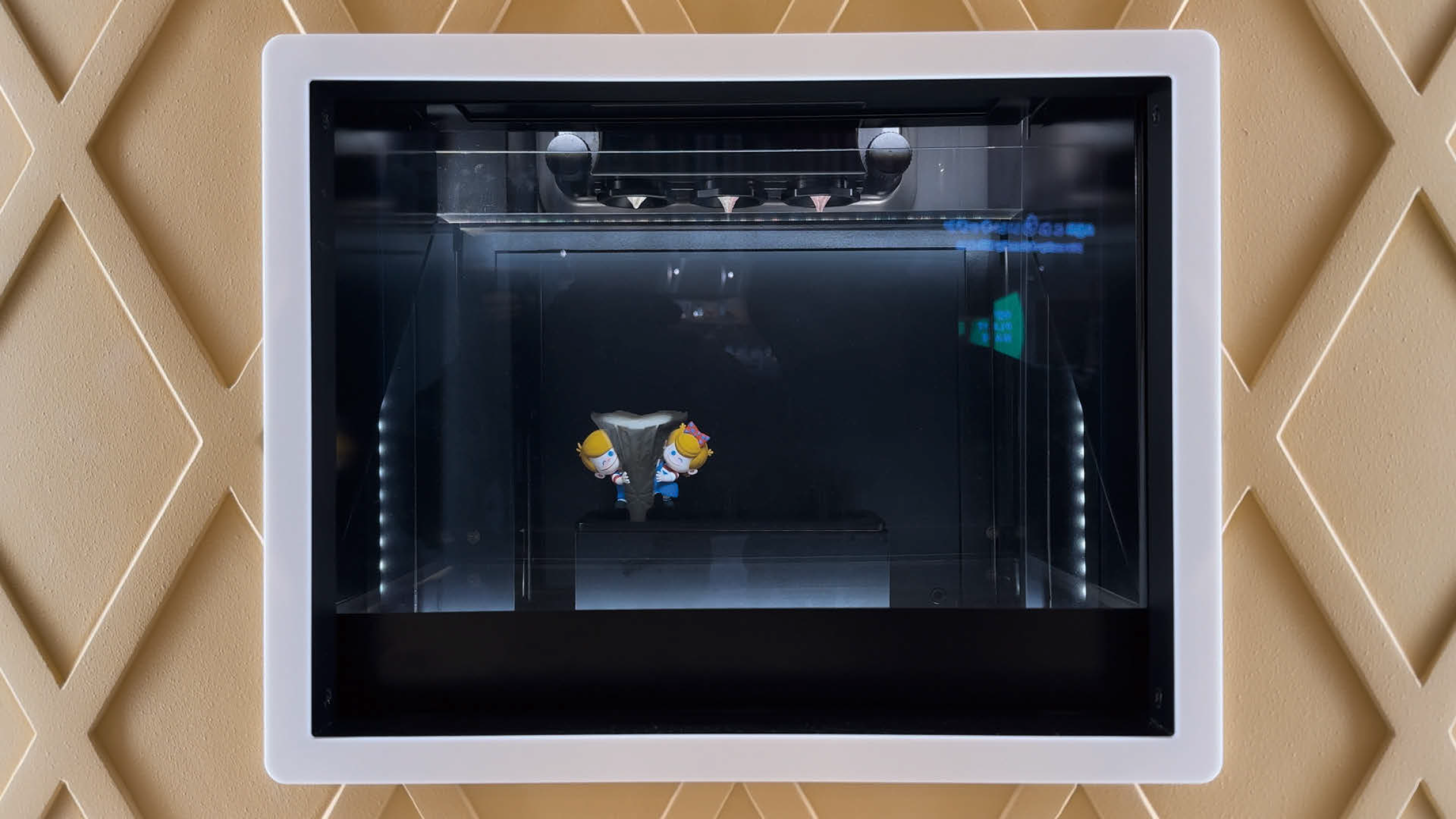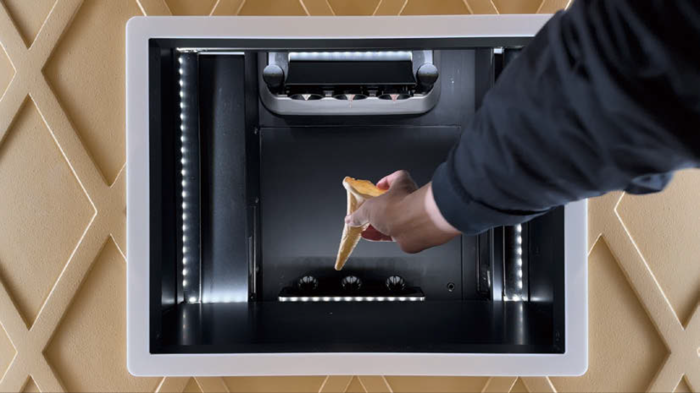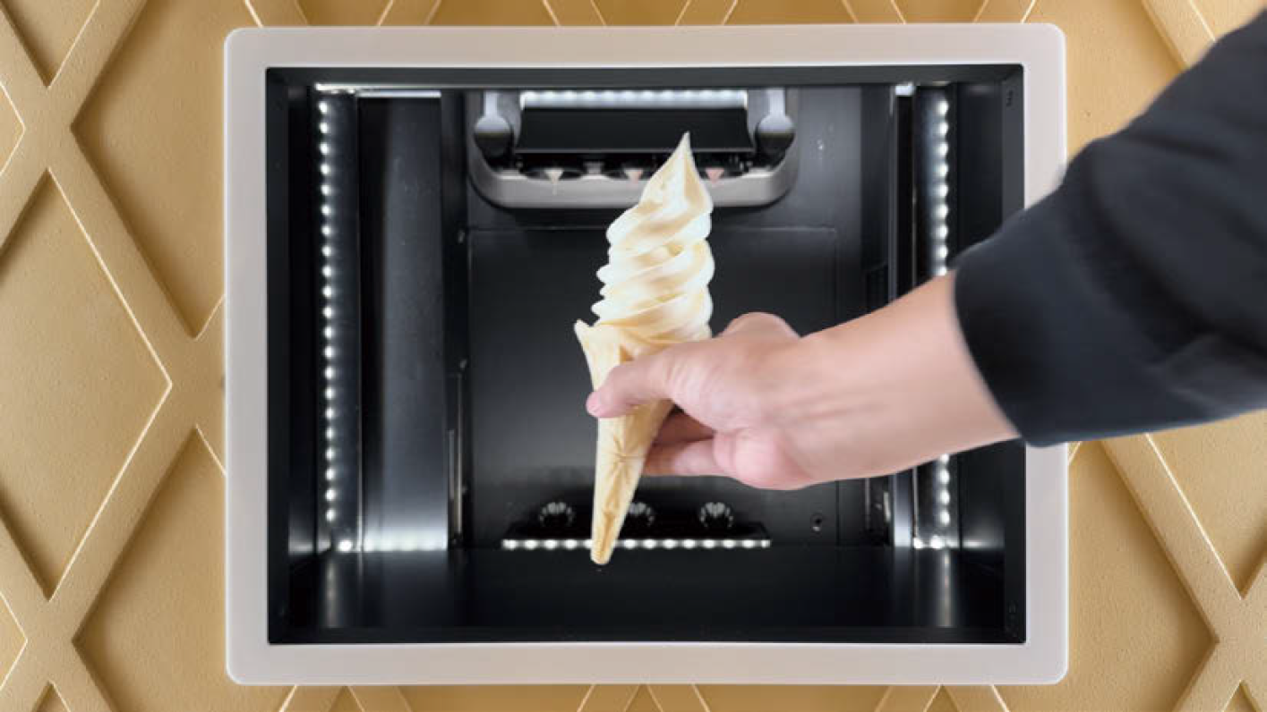 「将来、少子高齢化で省人化される未来も想像し、コーンを置いてボタンを押せば盛り付けまでが箱の中で完結するシンプルな設計にしました。お子さまやご年配の方、言語が違う方など、あらゆる方々に簡単にご利用いただけます。さらに、わくわく感や未来感は必要不可欠と考え、当社のキャラクターであるニックン&セイチャンの3Dホログラムが、盛り付けの様子を演出するプログラムを採用しました。世界各地から集まってきた方々や、子どもたちにとってソフトクリームにまつわる良い思い出を残したいと考えてのことです」。