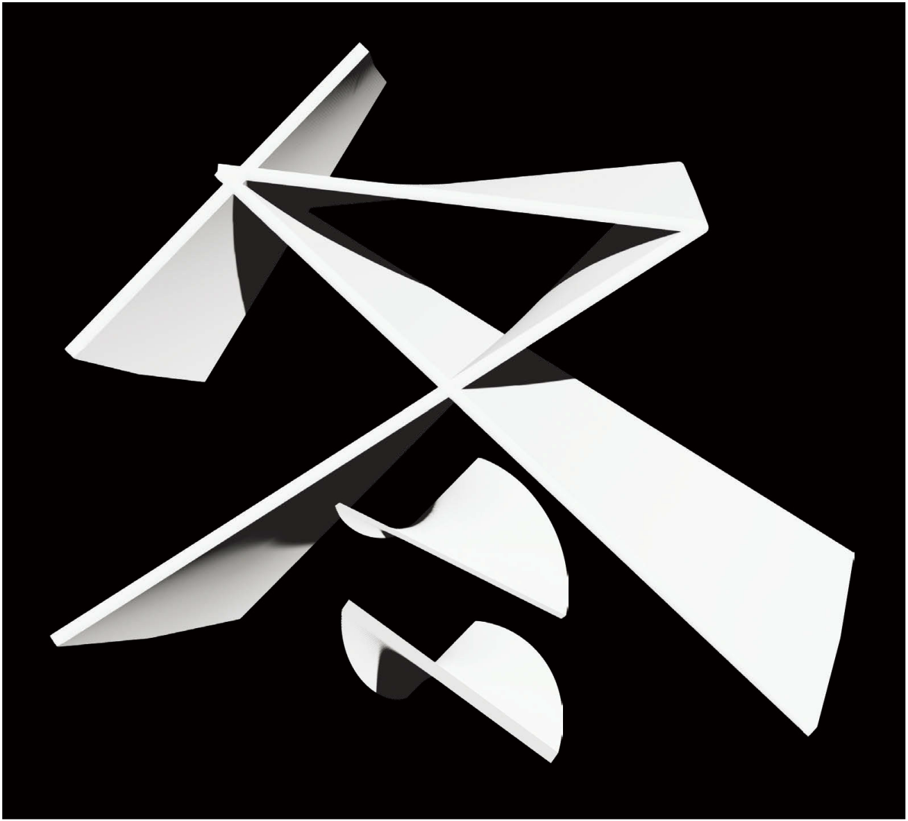 「Deep Winter」というテーマから、冷たく、宙に浮いたようで、わずかに不安定な、まるで動きの途中で時間がゆっくりと減速するかのような感覚のものにしたいと考えました。中心には、漢字の「冬」を断片化し、立体的に再解釈した造形を、空間に浮かぶように配置しています。冬の冷たさ、静けさ、そして空間が広がるような感覚。そんな時間が凍ったような状態を捉えることが狙いでした。「Deep Winter」は、再始動の直前に訪れる「一時停止」の瞬間とも捉えられ、内に潜在的なエネルギーを秘めていると感じています。「冬」という字に惹かれたのは、その構造から。上部は直線的な一方、下部は次第に曲線へと転じ、柔らかさを帯びていく。そこには静かに息づく動きや生命の兆しが示唆されています。