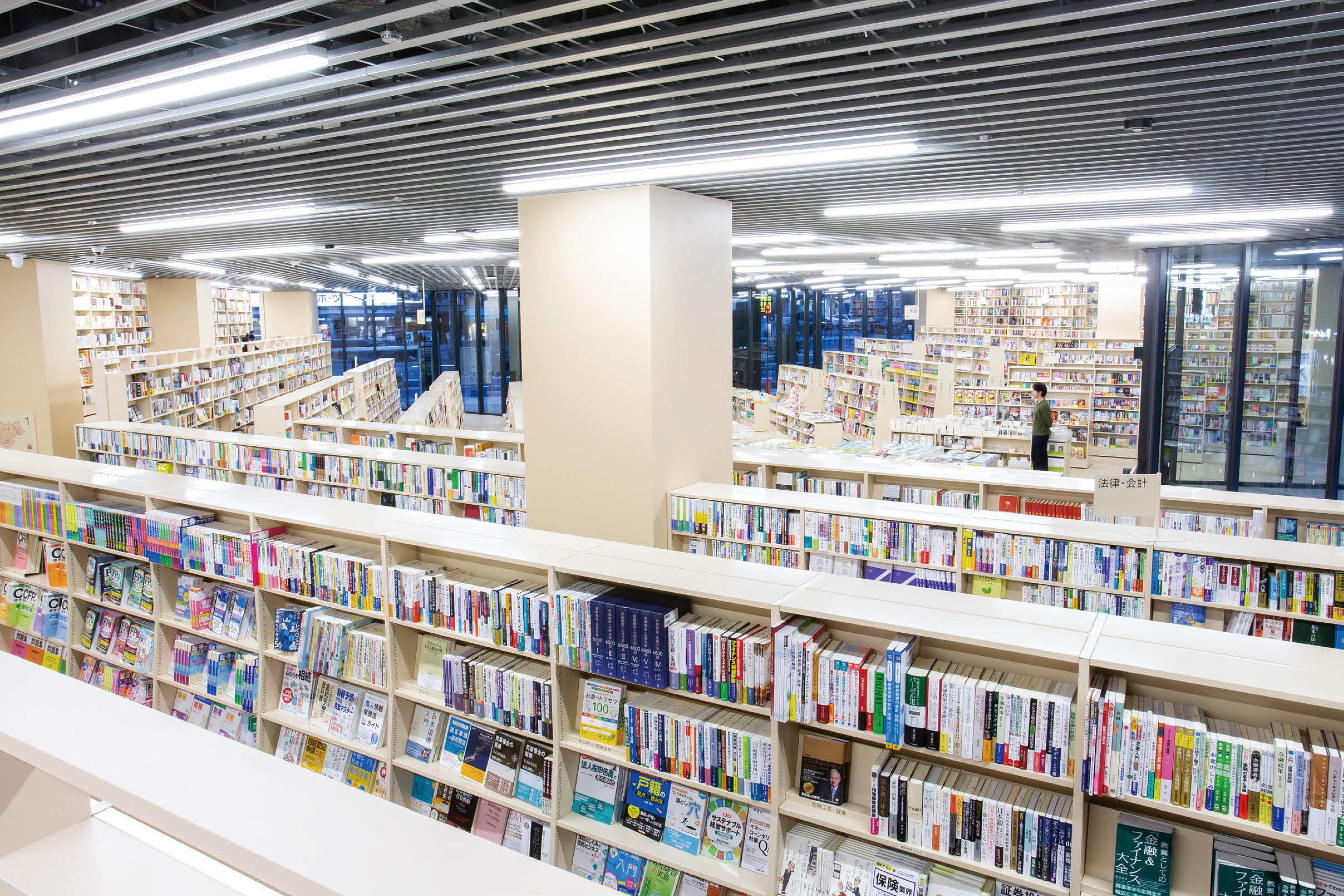 一歩足を踏み入れると、まるで渓谷のように左右に広がる本棚の数々。ゆるやかな起伏を持ちながら空間を形づくり、来店客を店の奥へと導く。谷の底を歩くように進むにつれ、多様なジャンルの本が視界に入る。まさに本で埋めつくされた、圧巻の光景だ。