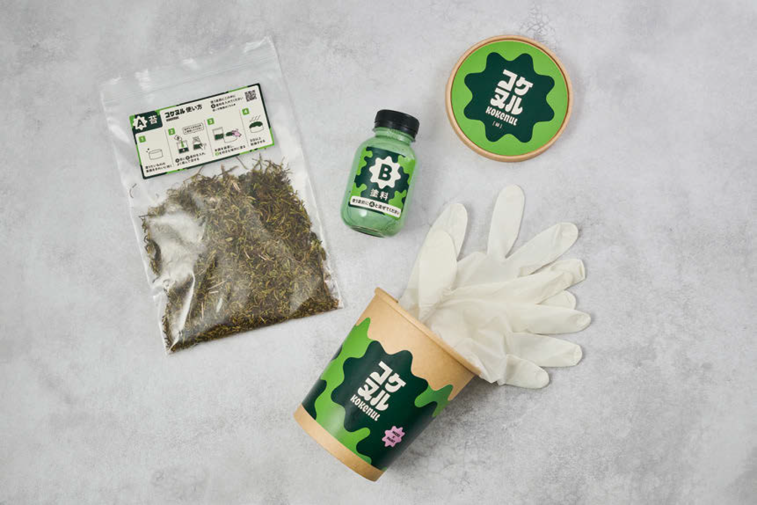 塗料メーカーの日研は2025年11月、コケでできた植物塗料「コケヌル」を発売した。成分の約50%は「スナゴケ」という生きたコケを原料としており、あらゆる素材にコケの質感を加えることができる。緑、黄緑、青緑の全3色で、オンラインを中心に販売している。