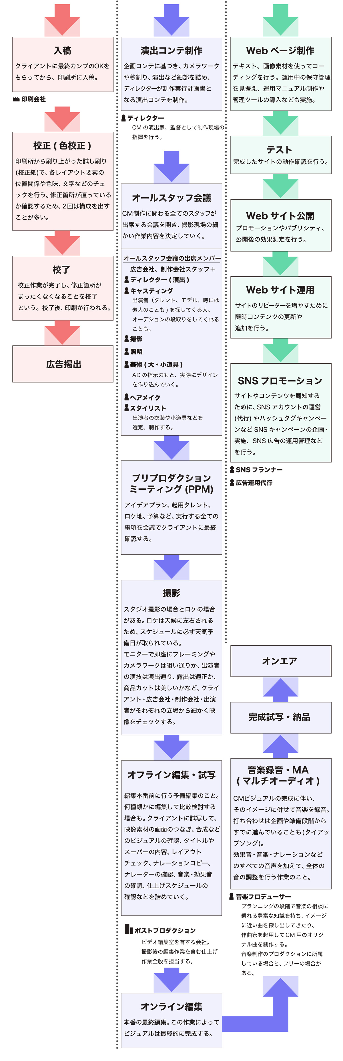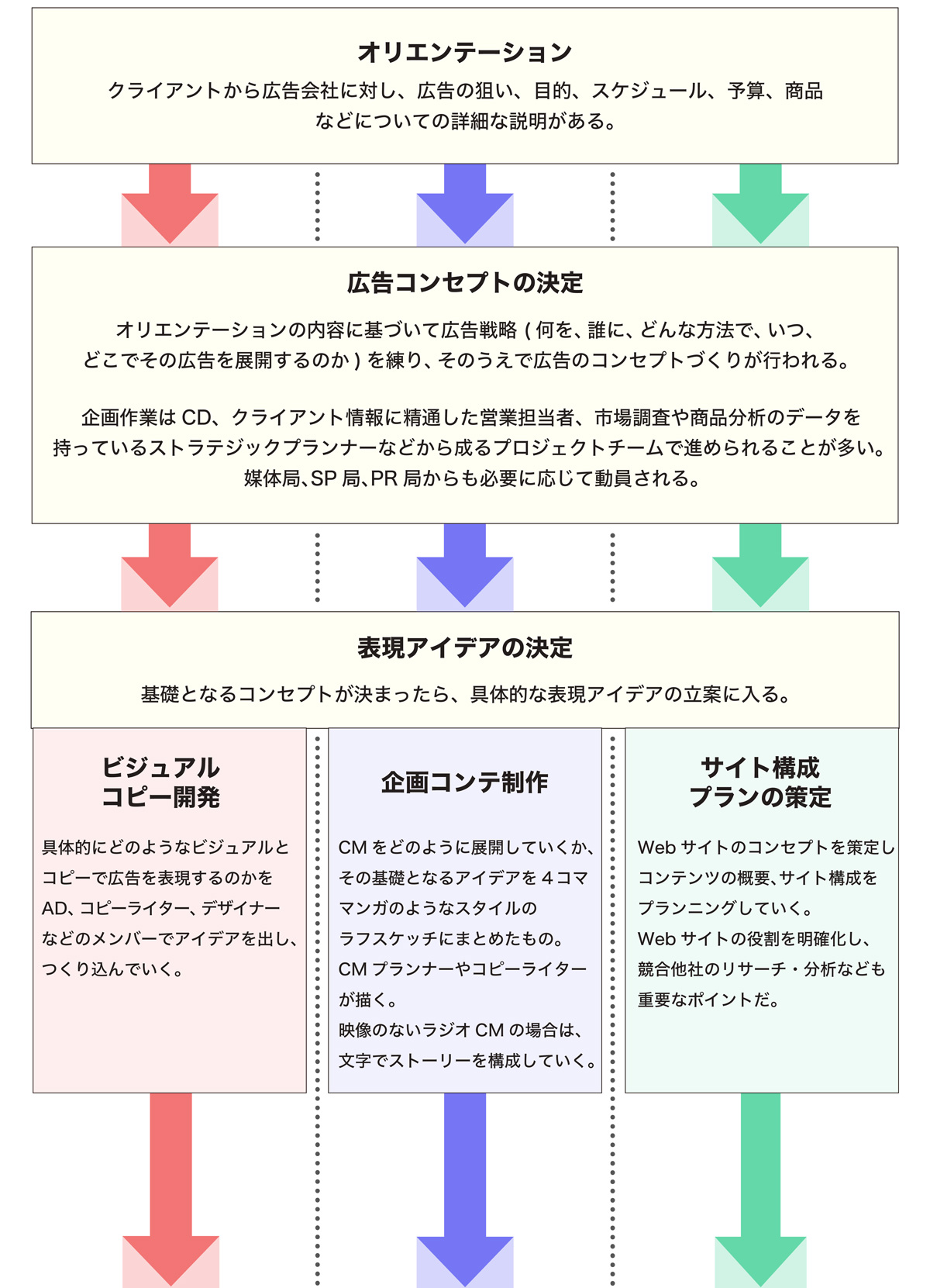 生活者(消費者)が広告を目にするまでには、どのような作業が行われ、どのような職種の人が関わっているのだろうか。その流れを紹介しよう。