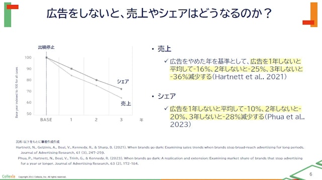 広告を1年停止すると売上が平均16%減少するという衝撃的なデータから、ブランド投資の真価を学びます。短期的な獲得効率(CTR)の罠から脱し、需要発生時に思い出される「想起率」をKPIに据えるべき理由を解説。ブランドが認知・想起を増やし、価格感度を下げることで中長期的な収益を支える構造を理解します。