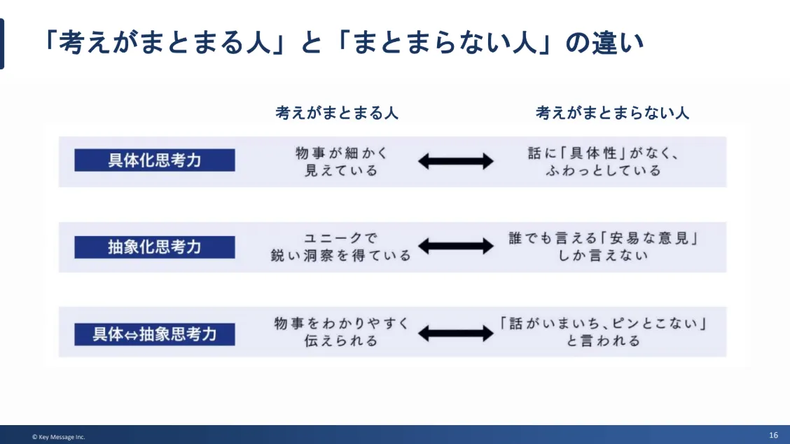 相手に伝わらない原因は、能力の差ではなく「思考の往復」にあるかもしれません。 話がふわっとしてしまう「具体性の欠如」、誰にでも言える意見しか出せない「洞察の浅さ」。 もしあなたが「考えがまとまらない」と感じているなら、まずは具体化と抽象化のメカニズムを理解することから始めましょう。物事を細かく捉え、ユニークな視点で語れる「まとまる人」への道筋を、本講座で提示します。