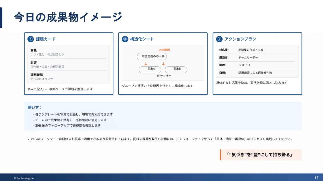 本講座では、単なる座学にとどまらず、受講後すぐに現場で使える3つのワークシートを完成させます。 課題カード:事実ベースで課題を整理し、理想状態を可視化する。 構造化シート:Whyツリーを用いて共通の上位原因を特定し、構造化する。 アクションプラン:具体的な対応策、担当者、期限、指標を定め、実行計画に落とし込む。 研修で作成した成果物は、写真で記録して現場ですぐに再利用・共有が可能。30日後のフォローアップまで見据えた、実践重視のプログラムです。
