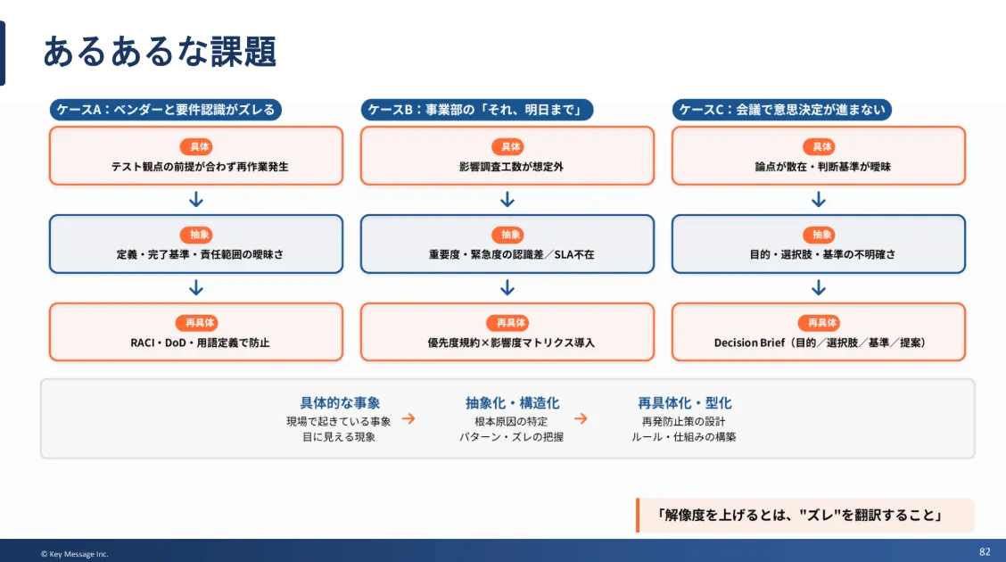 仕事がうまく回らない原因は、目に見える現象(具体)だけで対処しようとすることです。 本講座では、現場で起きている問題を一度「抽象化・構造化」して根本原因を特定し、誰もが実行できる「ルールや仕組み(再具体化)」へと落とし込む手法を学びます。 「解像度を上げるとは、"ズレ"を翻訳すること」。このプロセスこそが、場当たり的な対応から脱却する唯一の道です。