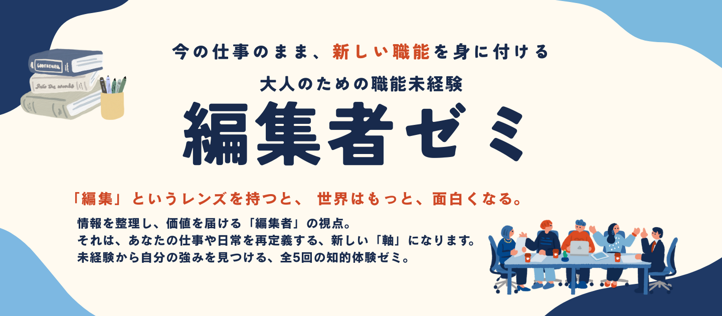 編集者ゼミは、未経験から「編集者のものの見方」を体験する実践型ゼミです。文章を書くことではなく、情報を集め、選び、構造を与え、価値として届ける――