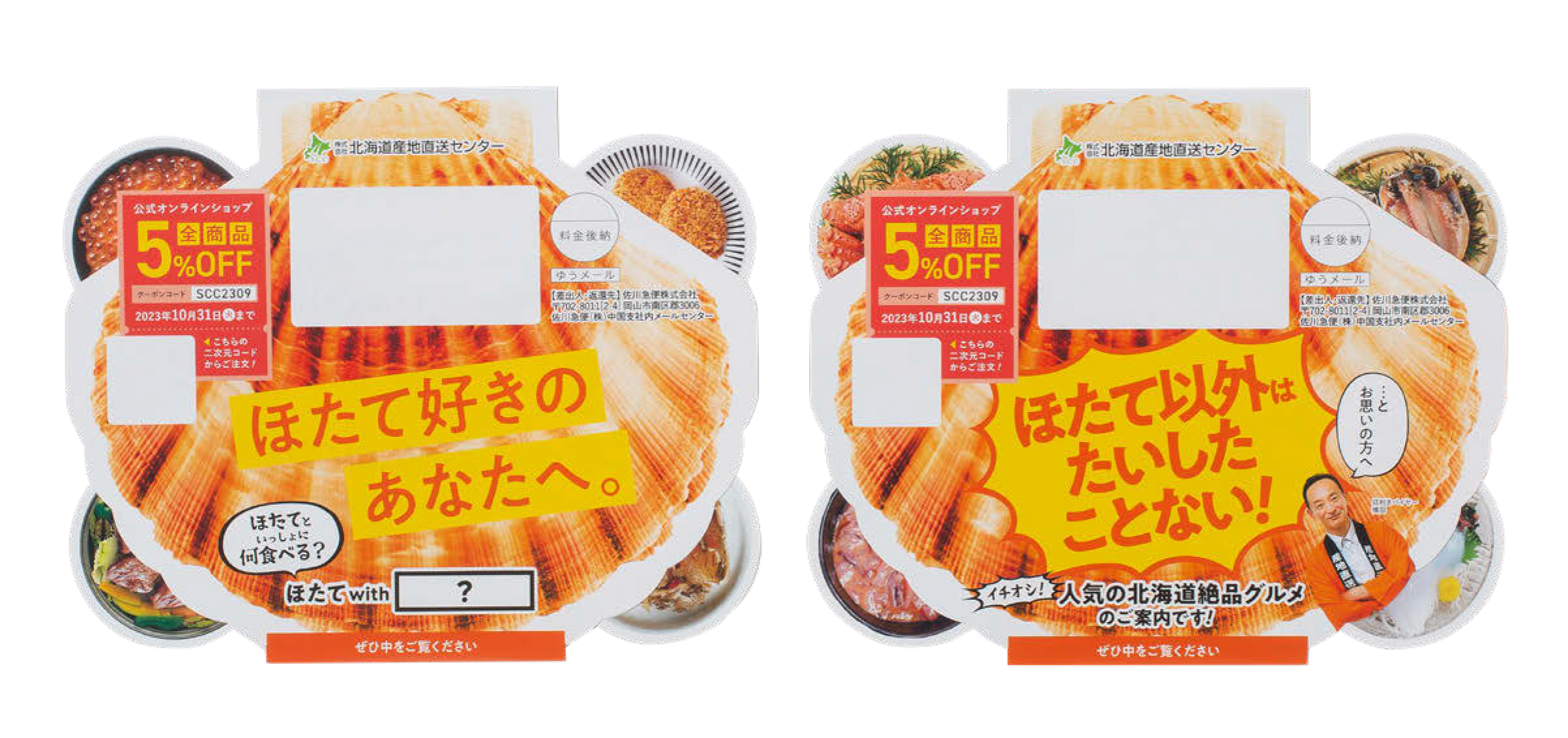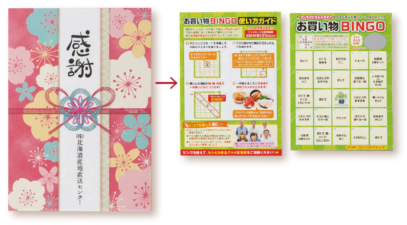 北海道産地直送センターは、年3回以上購入の顧客へ向けた「購入履歴反映ビンゴDM」と、購入単価の低い顧客に向けた「ほたて型DM」を制作した。いずれもDMを入口にクロスセルを駆使し、既存顧客のリピート率を上げる施策。
