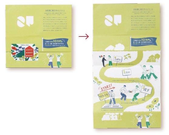 泉北ホームで家を建てた施主に対し、友人や知人へ同社の紹介を促すためにDMを実施。住宅は単価が高く、紹介する側にとってもされる側にとってもハードルが高いことから、紹介率を上げるために、手軽に渡せるカードを作成したり、紹介メリットを明記したりと、様々な工夫を行った。