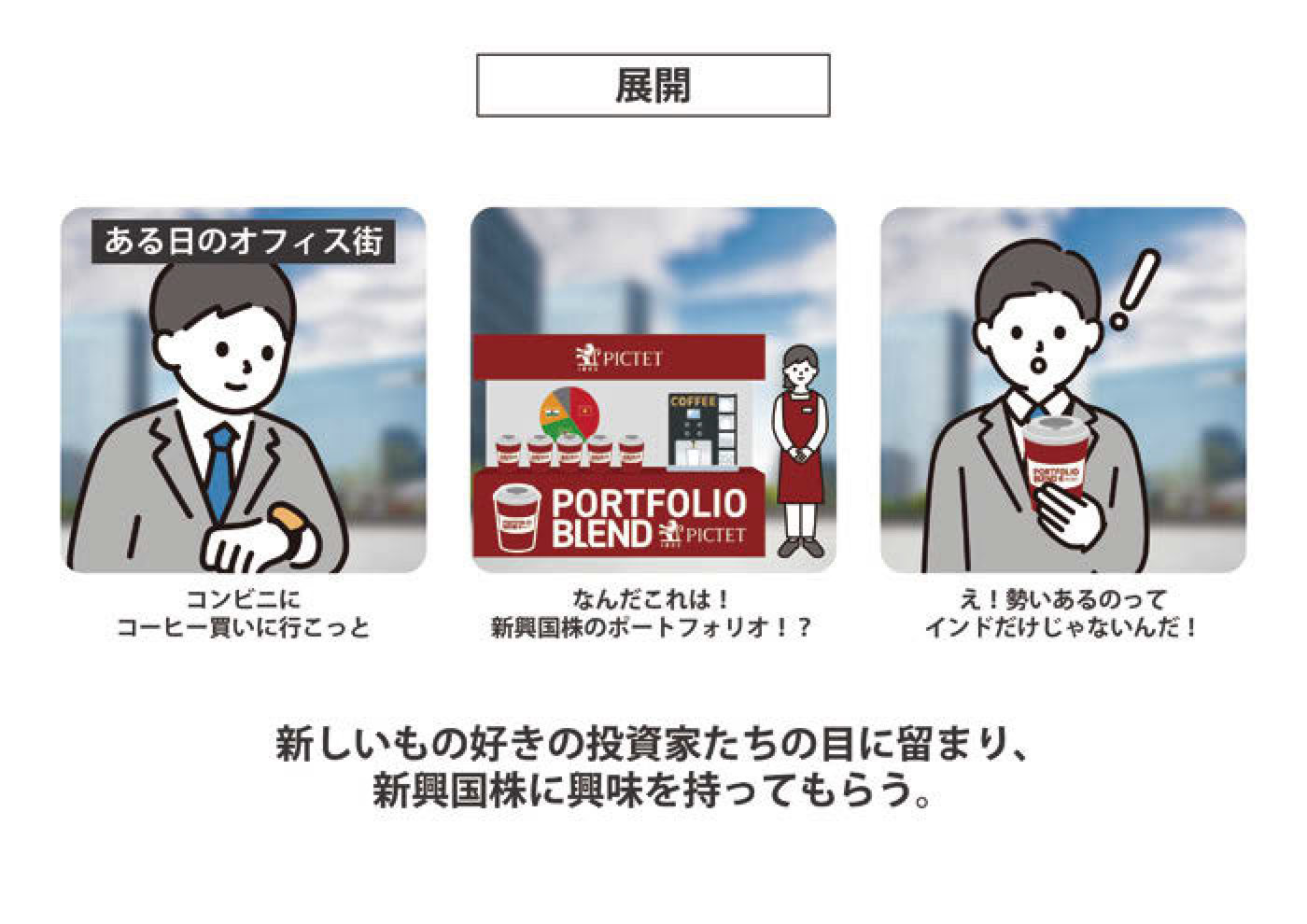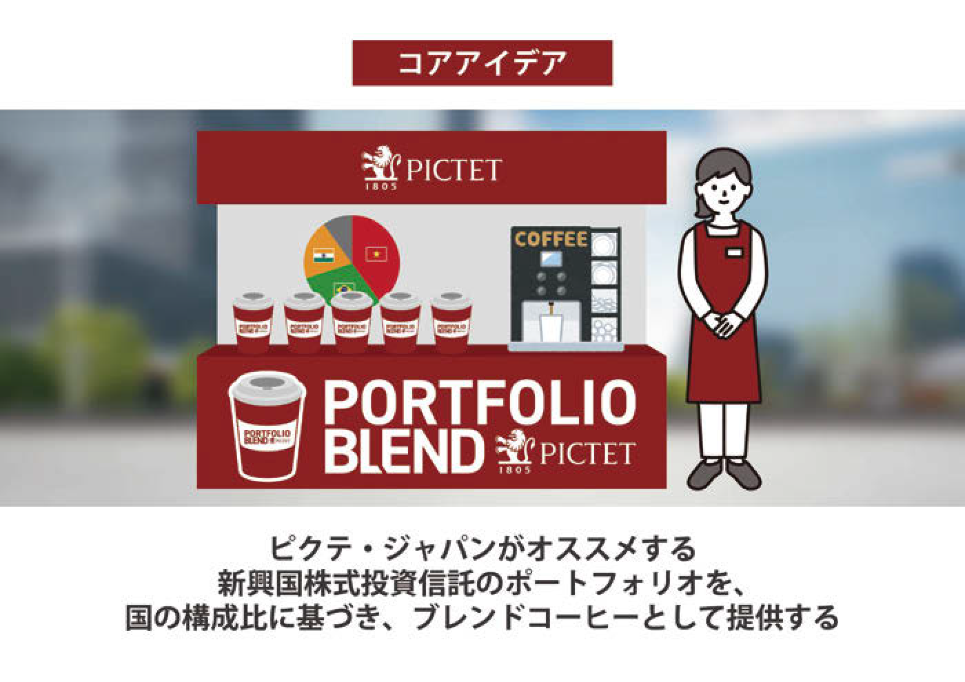投資に関する意思決定は左脳を使ってじっくり行うもの。そこに一杯のコーヒーが入ることで、落ち着いてお客さまは投資判断ができることでしょう。さらにそのコーヒーを通して投資先(ポートフォリオ)の国に想いを馳せることができる。資金運用という無味乾燥とも言える意思決定に素敵な香りが広がる。そんな素敵なプロモーション空間が誕生します。あとはそんな「ブレンド」がいろんな意味で美味しいものであることを願います。