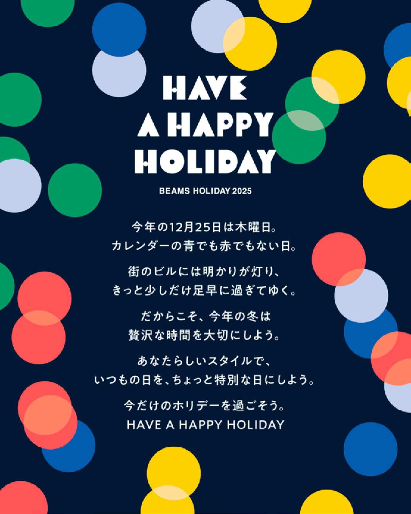 ビームスは、2025年11月21日から12月25日まで、ホリデーシーズンに向けたキャンペーンとして「BEAMS HOLIDAY 2025」を開催。「HAVE A HAPPY HOLIDAY」をテーマに、店舗やオンラインで複数の施策を展開した。