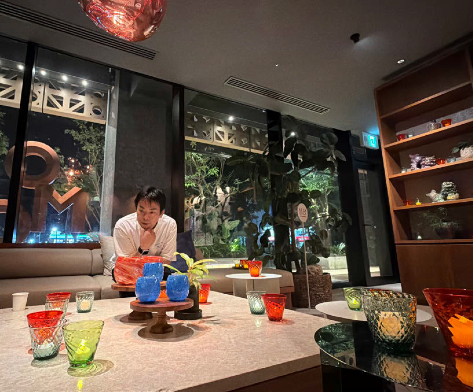 OMO5沖縄那覇のラウンジ。夜は、青い海や草花を想起させる琉球ガラスのあかりが灯る空間となる。