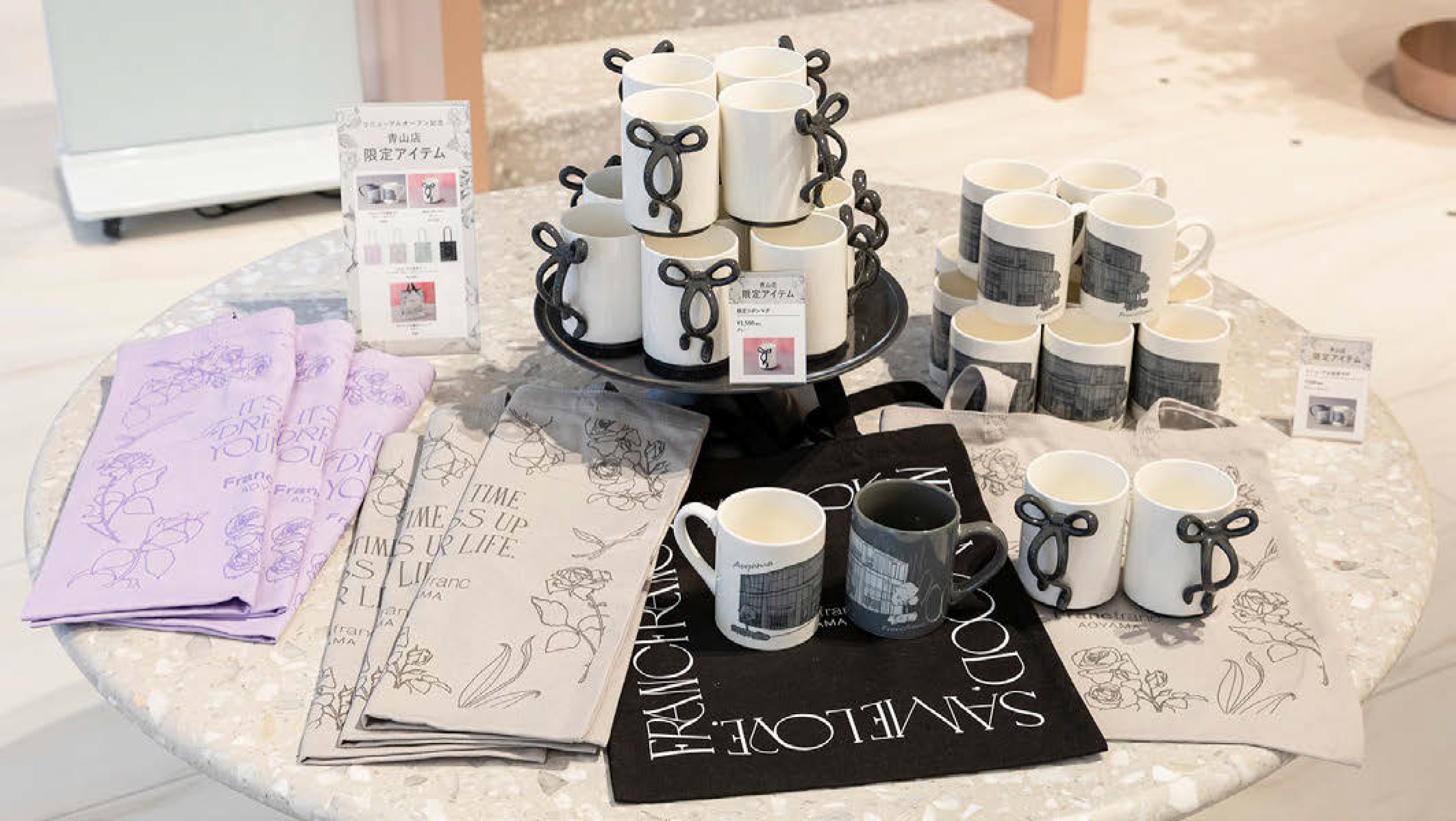 青山店のリニューアル記念限定グッズとして、ブラックやグレーをアクセントにしたエレガントなモノトーンの...