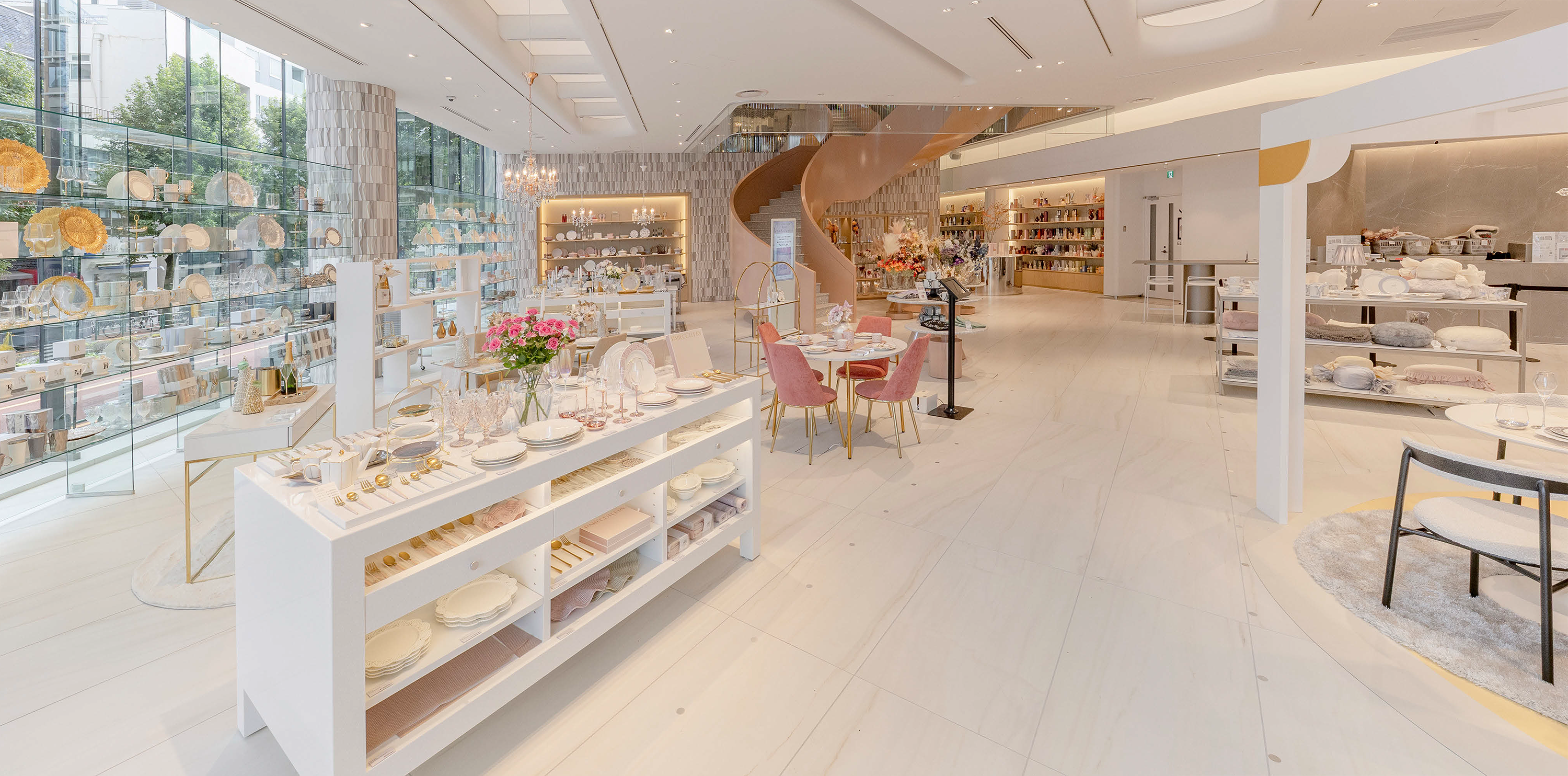 以前は雑貨の平台展示や棚が多く並んでいた1階エントランス前も、ダイニングやリビングのコーディネート空間に変更。明るいホワイト基調に床材も一新し、通路幅も広く取ることでゆったりとした雰囲気になった。