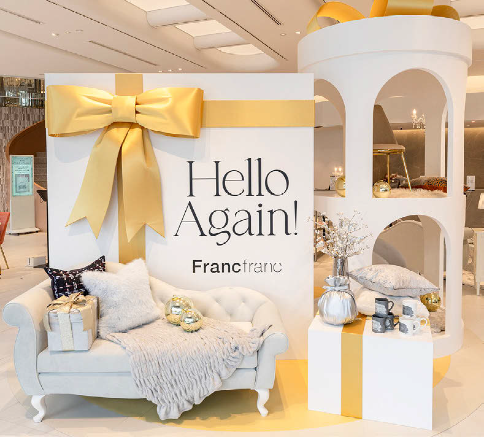 来店客にリニューアルオープンの高揚感を感じてもらうため、エントランス前には「プレゼントのリボンを紐解く瞬間のように、ワクワクした気持ちで新たなフランフランに巡り合ってほしい」という想いを込めた期間限定モニュメントを設置。11月14日からはクリスマス仕様に変更された。