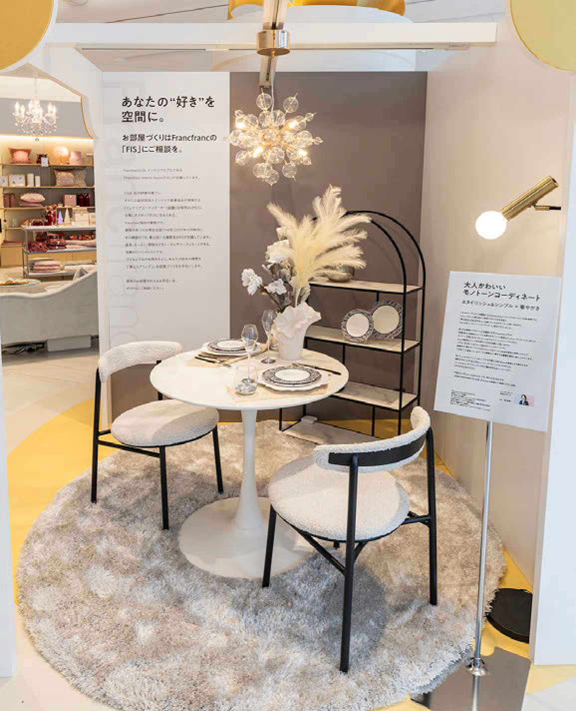 オブジェ裏にはフランフランのインテリア専門スタッフFISによるコーディネート相談を紹介する掲示を設置。パネルでは「大人かわいいモノトーンコーディネート」をテーマに組んだインテリア例について、視覚だけでは伝わりにくいポイントを言語化してその魅力を提示。担当スタッフの写真入りで紹介している。