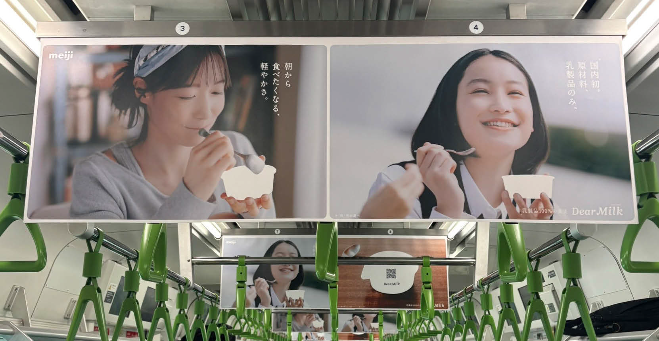 株式会社 明治は、5月15日から約2週間にわたり、アイスクリーム「明治 Dear Milk」のプロモーションとして、商品パッケージ部分を白抜きにした異例の交通広告を展開。東急田園都市線、JR山手線、大阪メトロ御堂筋線の車内ジャックをはじめ、東急渋谷駅の大型ポスターなどで実施された。