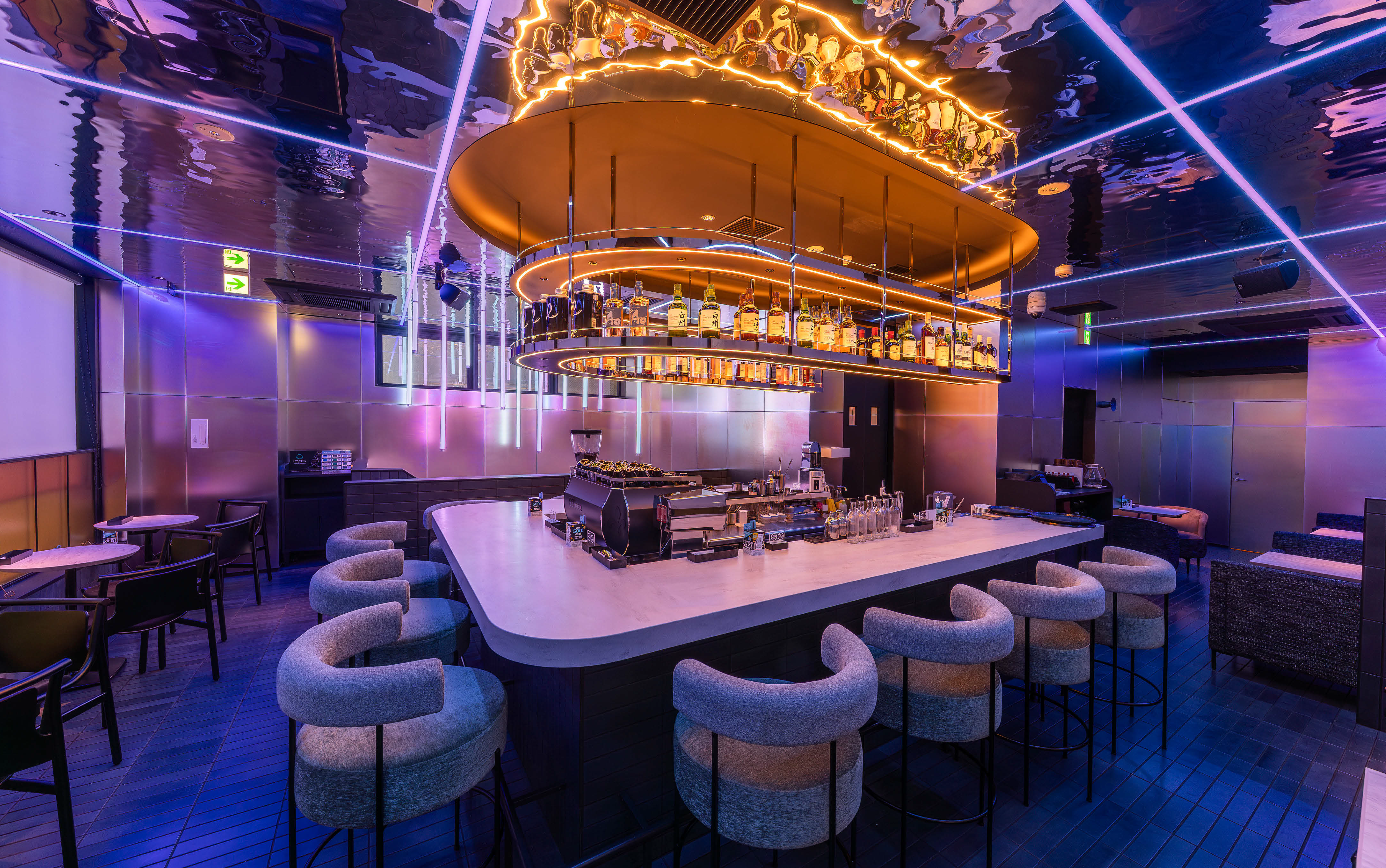 SF映画に出てくる宇宙船のようなブルー空間の中央にバーカウンターを配した。その上にはウイスキーのボトルを並べ、光が通ることにより琥珀色の液体を通して生まれる明かりがアクセントとなっている。カウンター席、テーブル席、ボックス席があり、全35席。