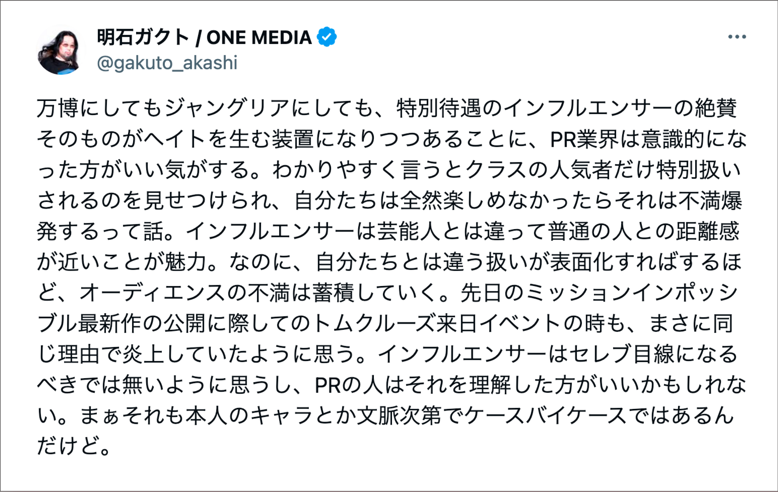 2025年7月に、私は自身のXで「新しいテーマパークにインフルエンサーを秘密裏に先行招待するようなPRは、生活者から不満を呼びやすい」と指摘しました。あれは僕自身が業界の内側から見てきた経験に基づく意見でしたが、多くの人からの共感や意見を呼びこみ、この問題が社会全体の関心事になっているのだと実感しました。