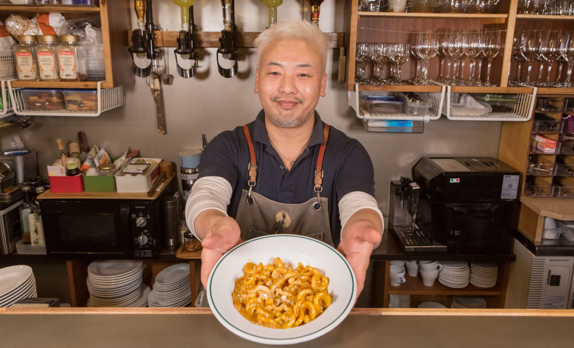 今晩のディナーメニューから「牛スジ肉とポルチーニ茸のクリームソースパスタ」の皿を差し出すオーナーシェフの山下真さん。ゆっくり過ごしてもらいたいので時間制限は設けていない。真さんが調理、サービスは妻の真希さんとスタッフの2名が担う。