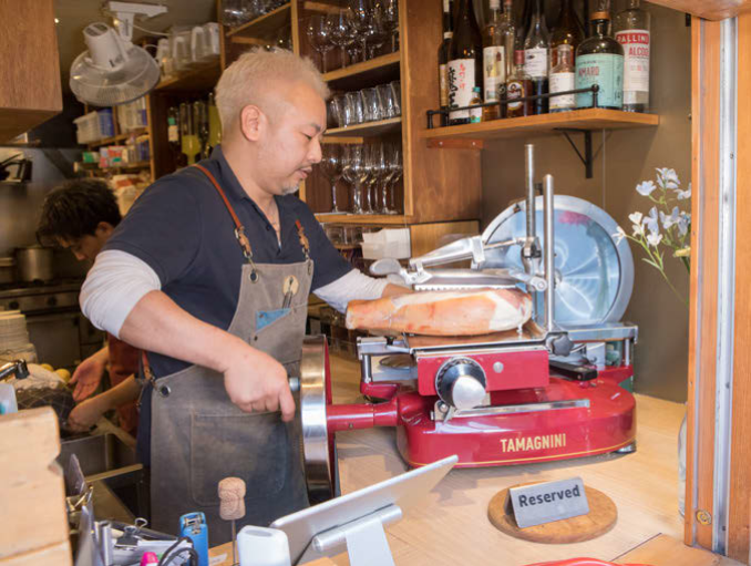 生ハムはシェフ自ら丁寧に切って出す。「ハム専用のスライサーはイタリアから取り寄せました」。開店4周年となる4月16日周辺には生ハム増量キャンペーンも予定している。