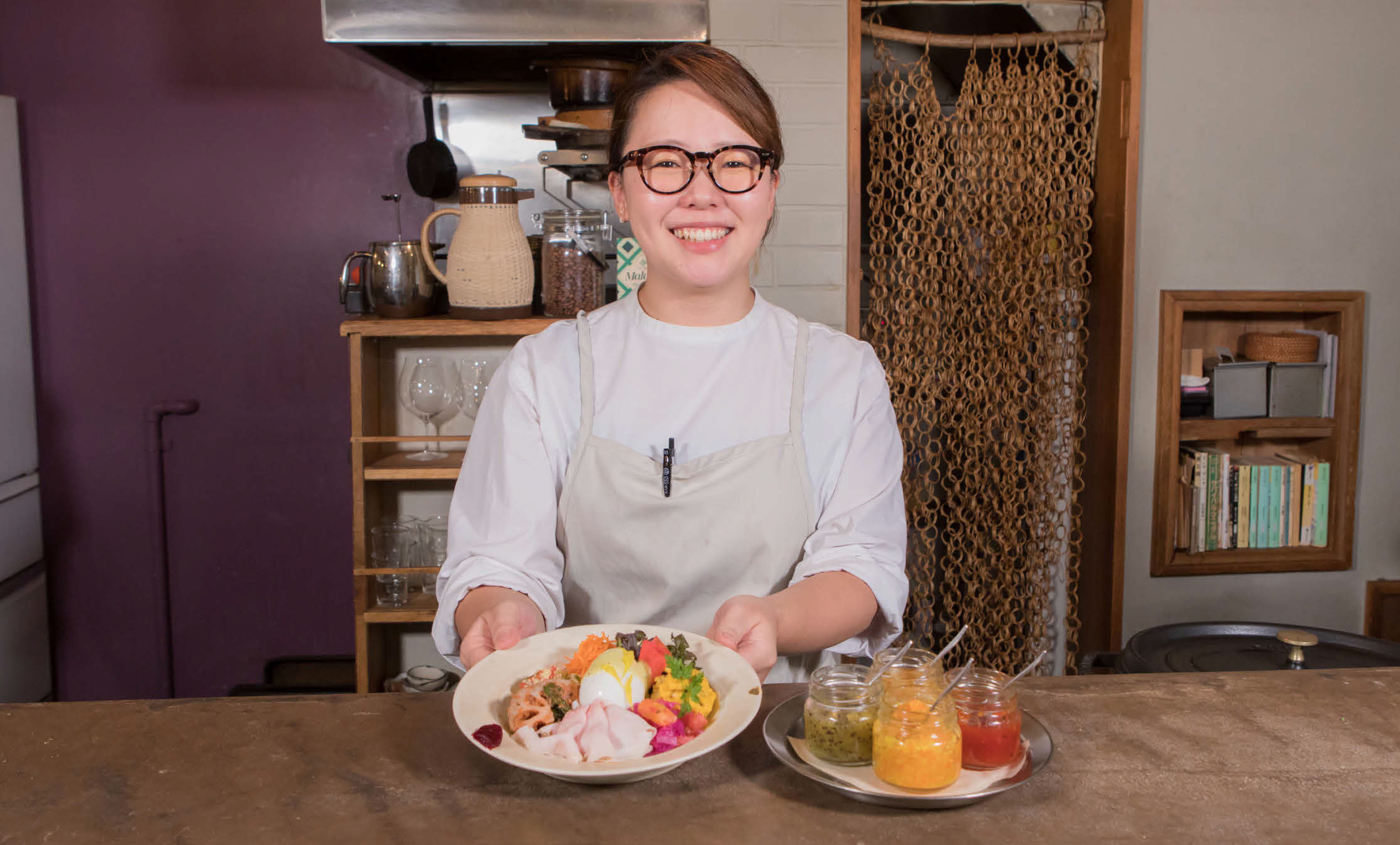 モーニングの一番の人気メニューが岩村さんが手に持つ朝限定の「プレート」。自家製ハムや、半熟卵に自家製マヨネーズをかけた「ウフマヨ」、クスクスサラダや、トマト、紫キャベツなど野菜各種が日替わりで並ぶ。自家製のジャムも4種類つく。この日は「リンゴとナツメ」「トマトとハーブ」などが。「お客さまがお帰りになる際はなるべく店の前までお見送りするよう努めています」と岩村さん。
