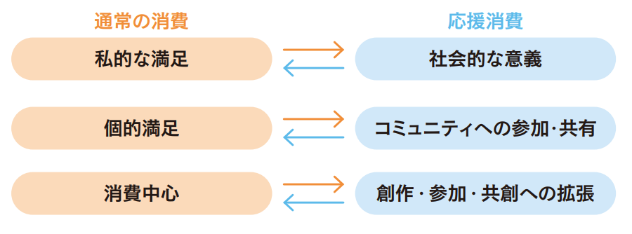 購入者自身のニーズを満たすための消費は自己充足を軸としているが、応援消費においては社会に向けて行われることが多く、仲間と連帯し...