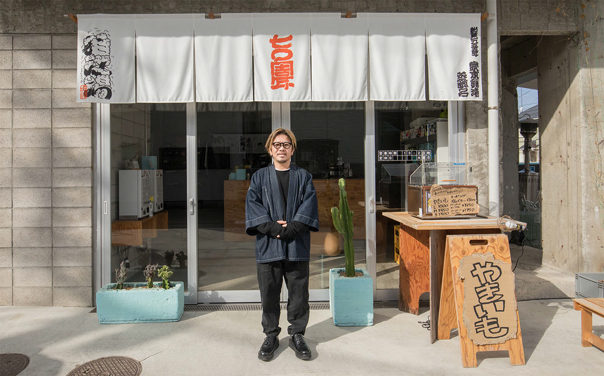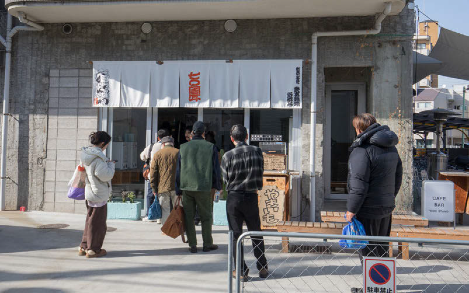 店主西川氏の背後にかかる暖簾にはまっ白な地に赤く「七〇周年」の文字が入る。従来型の銭湯と異なり中が見通せて、外からでもカフェバーがあるのがわかる。「今では遠方から来ていただける方が全体の約半分です。女性のお客さまが多いのですが、初めてでも入りやすい造りのせいかもしれません。焼き芋も昨年から販売を始めました」と西川氏。開店時間になるや、シニア層・若者を問わず客が続々入店してきた。