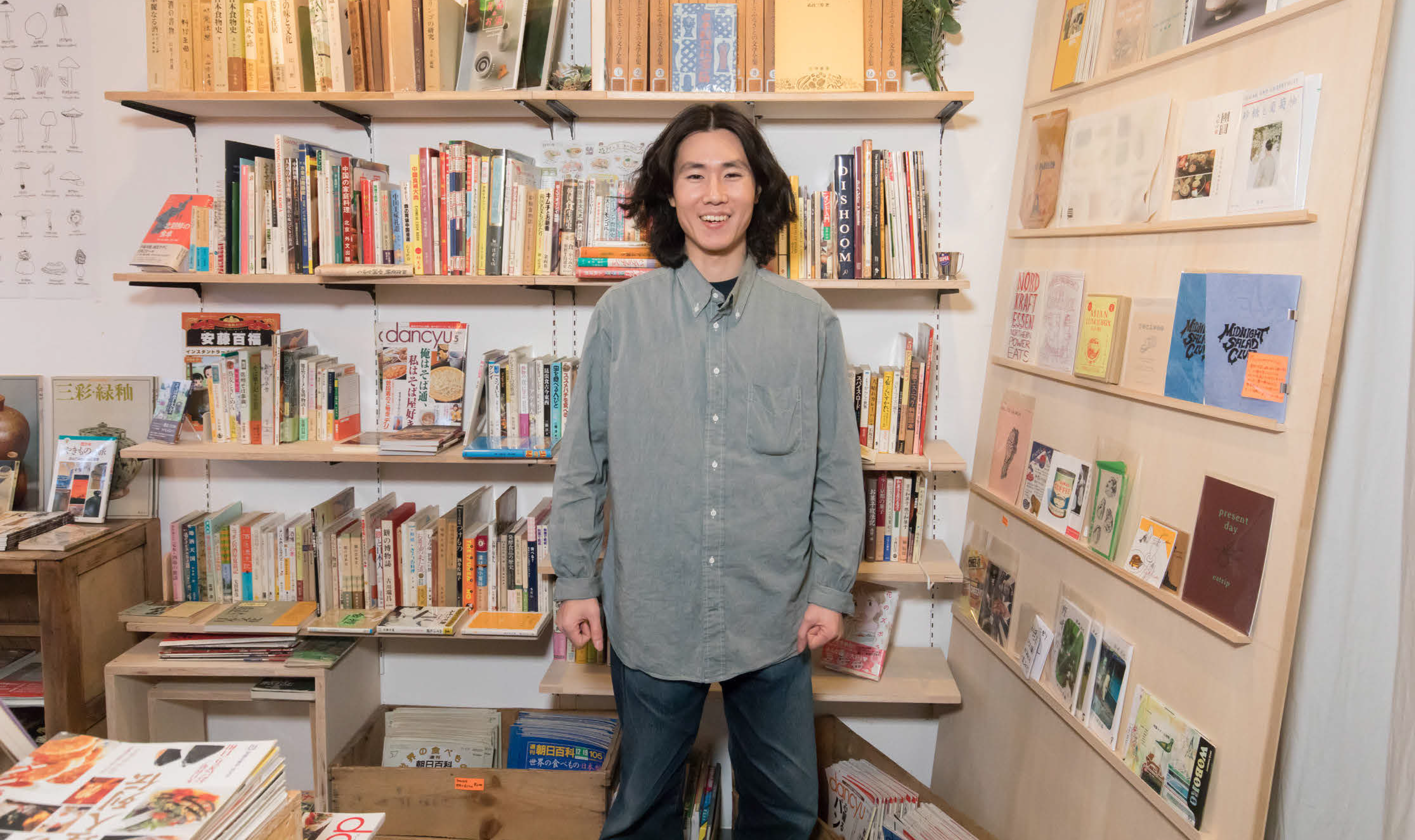 書棚を背景にした関氏。彼の横には本を立てかけて並べる棚が。「ここの本もそうですが、店内ではなるべく表紙をお見せするようにしています」と話す。古書店では、普通、店外の均一価格本棚にしかないような「100円」と値付けされた文庫本が店内で思わず見つかることも。「お客さまから『値付けがおトクすぎ……』と指摘されることもあります(笑)」。