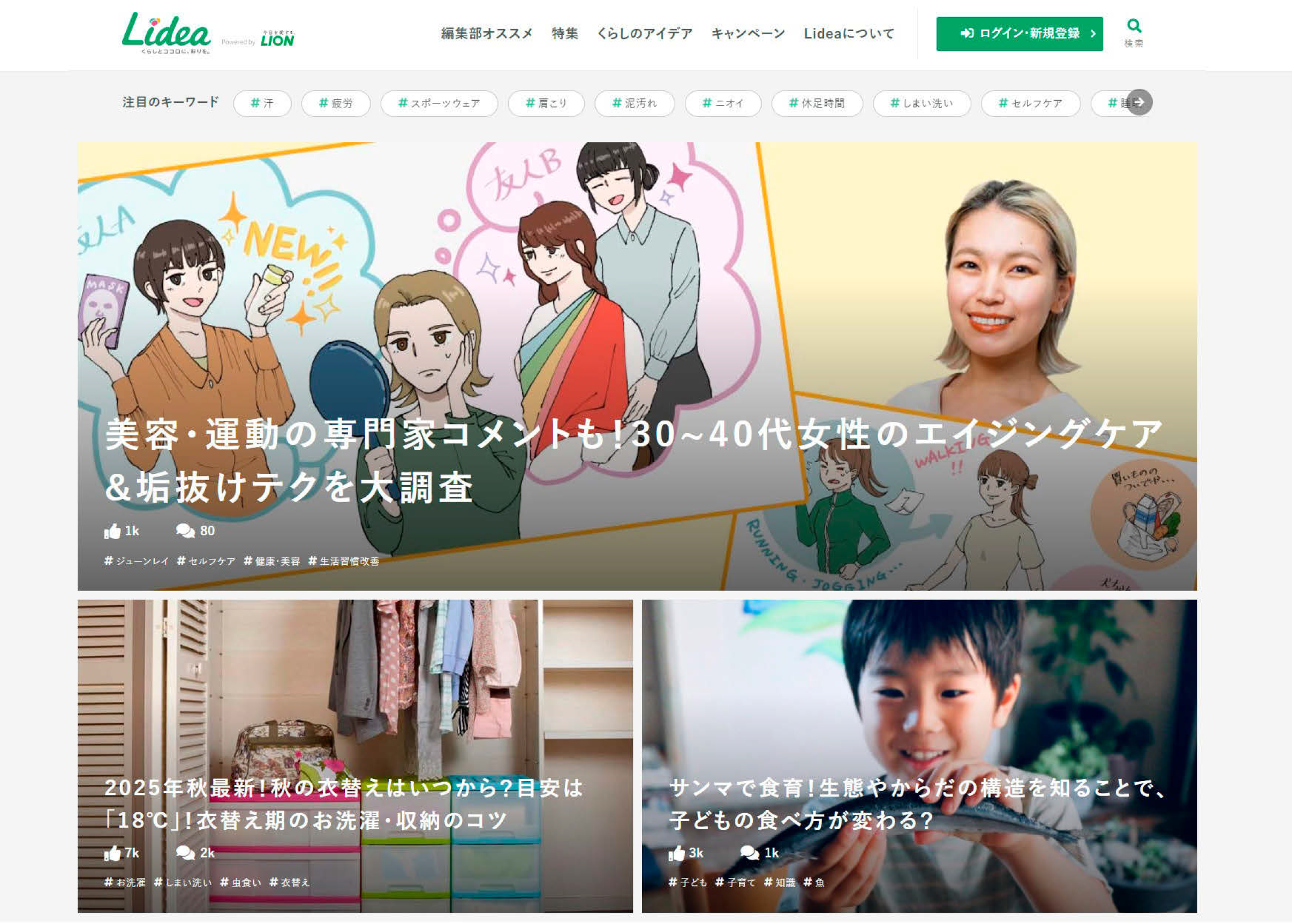 ライオンの製品や技術を背景に、暮らしに役立つハウツー記事から、ユニークな企画まで幅広いコンテンツを発信している「Lidea」。専門知識を持つ暮らしのマイスターが記事を作成・監修し、確かな情報を届けることで、ユーザーの生活に寄り添い、毎日をより豊かに楽しんでほしいという願いが込められている。