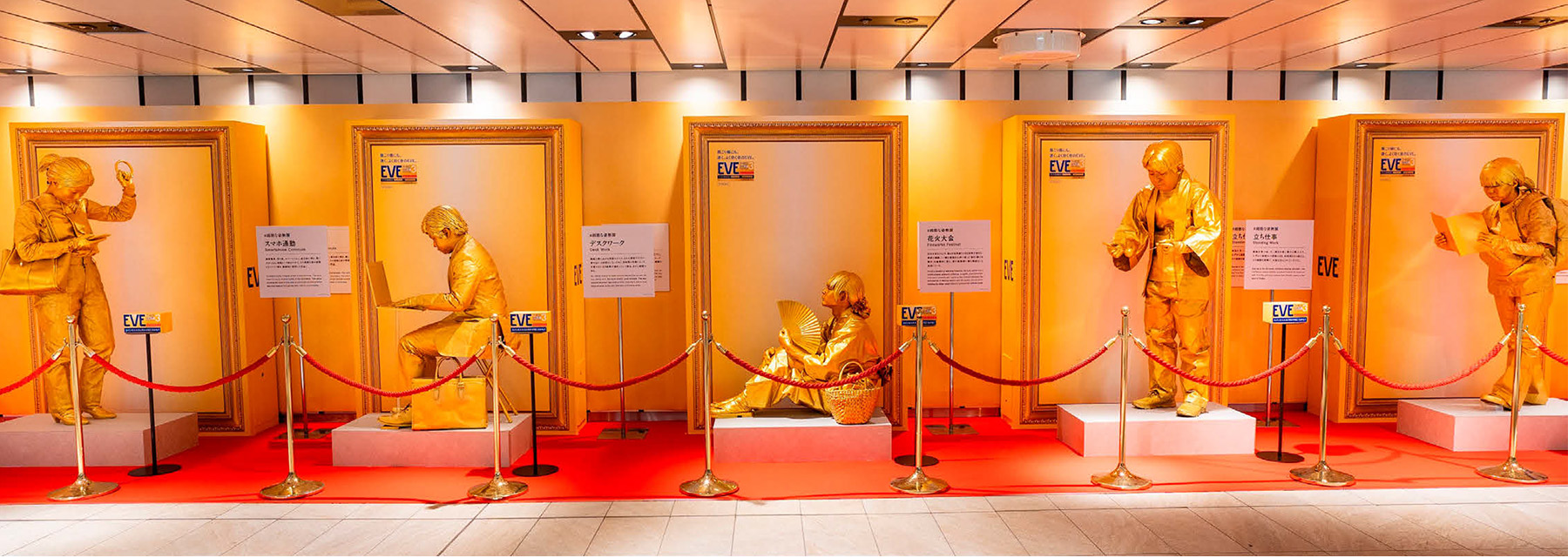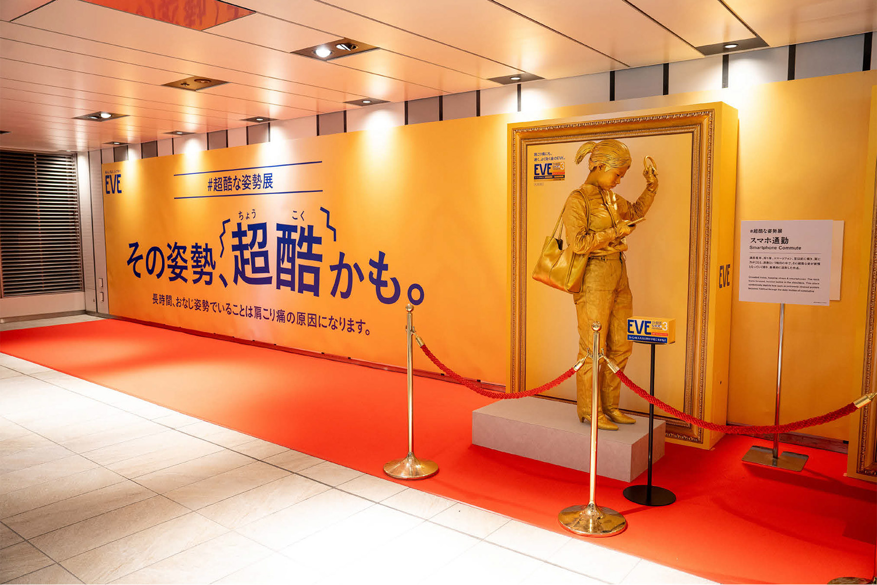 エスエス製薬は8月、自社の鎮痛剤ブランド「EVE」シリーズの「イブスリーショットプレミアム」を訴求するイベント「超酷な姿勢展」を実施した。全日程7日間のうち3日間、1日 4回、彫像パフォーマーが登場。デスクワークや通勤電車、花火大会、観光など、長時間同じ姿勢を取り続けるシーンをパフォーマーが再現し、展示した。