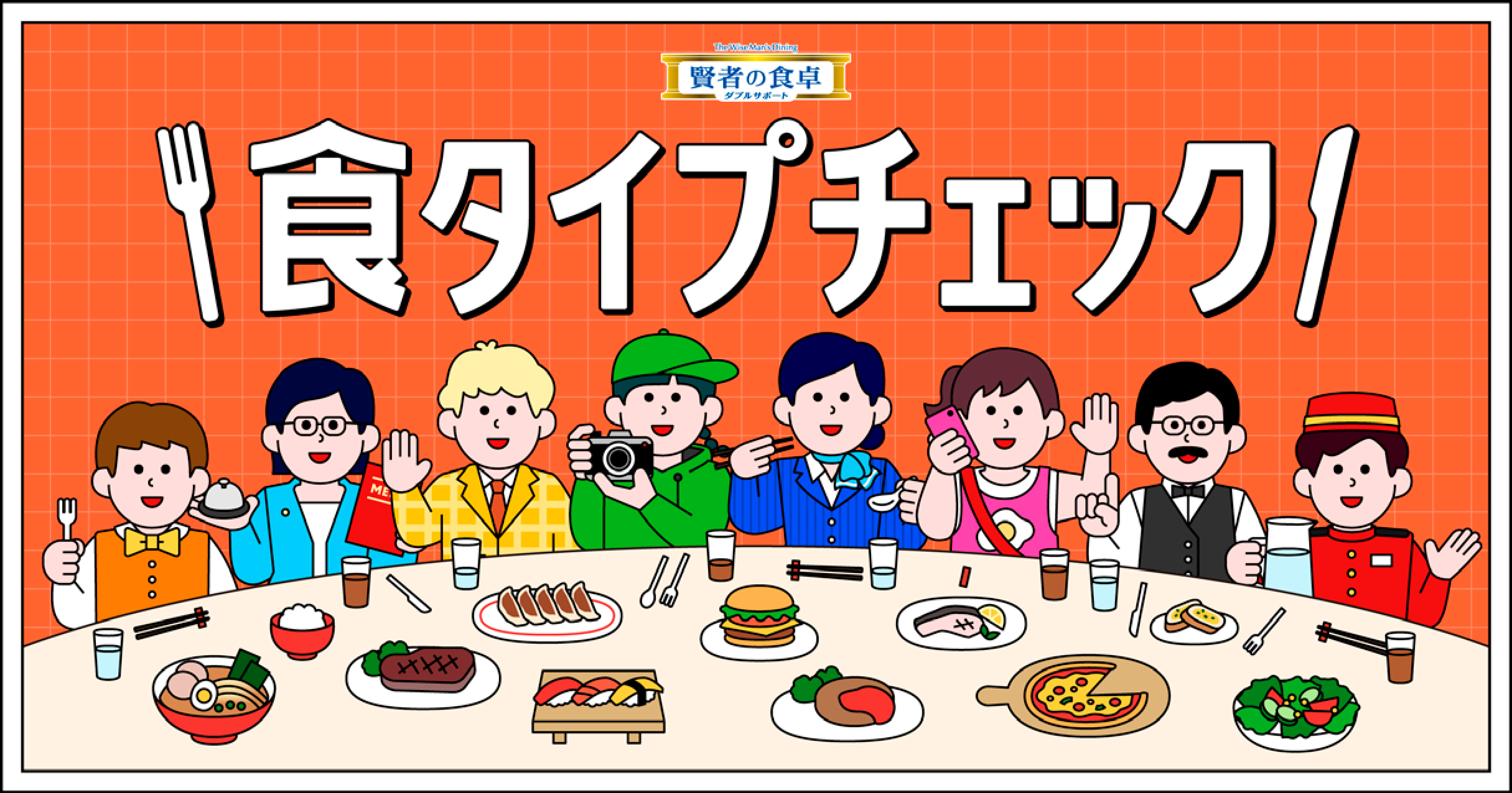 キービジュアル。食タイプの名前やイラストの方向性については、食事の要素を汲みつつ、そのタイプの特徴を捉えることに苦労したという。動物の食事イメージと絡める、スパイスに例えるなど、様々な方針を考えたが、最終的には体験者のわかりやすさを第一に考えた。