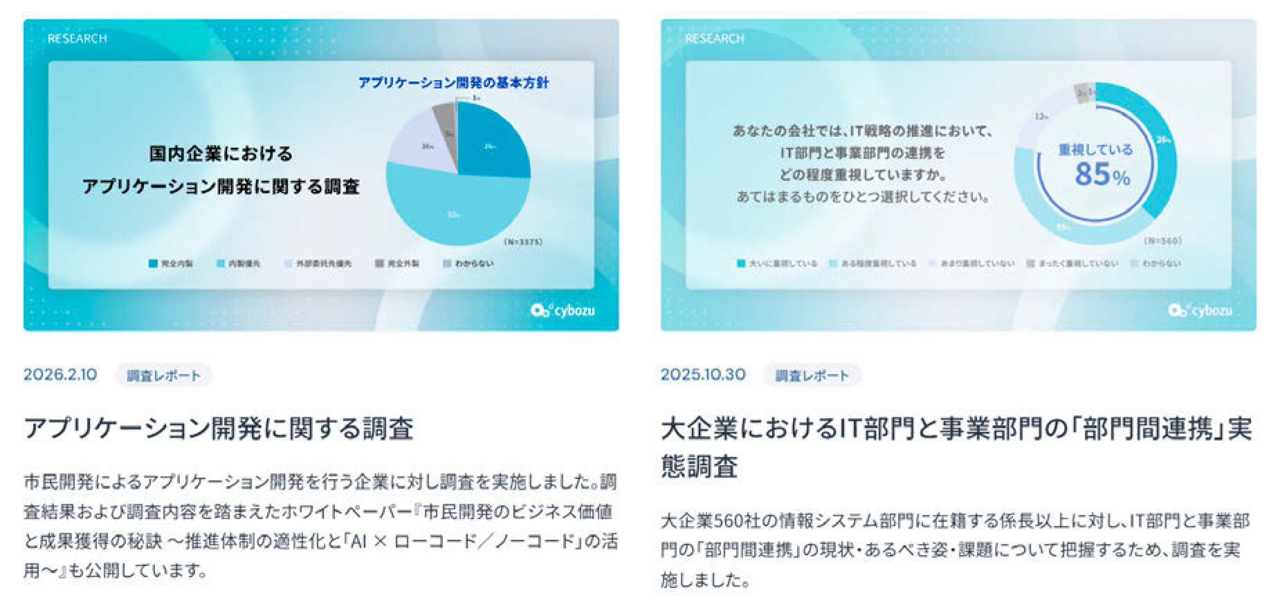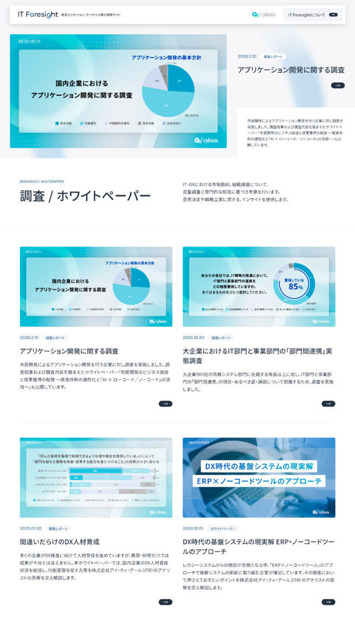 メディアの核となる「調査/ホワイトペーパー」では、IT・DXの市場動向や組織課題を定量調査と専門的な知見で紐解き、意思決定や戦略立案に役立つインサイトを発信。例えば、「大企業におけるIT部門と事業部門の『部門間連携』実態調査」は、従業員1000人以上の大企業560社を対象に、IT部門と事業部門の連携の現状や課題を整理した調査レポート。企業の85%が部門間連携を重視し、経営層の関心も9割に上る一方、実際に支援しているのは約半数にとどまるなど、理想と実行のギャップを示している。他にも「アプリケーション開発に関する調査」では、企業のアプリケーション開発の現在地を整理してレポート。AIやローコード/ノーコードの浸透が、企業の開発体制にどう影響しているかを俯瞰できる記事になっている。